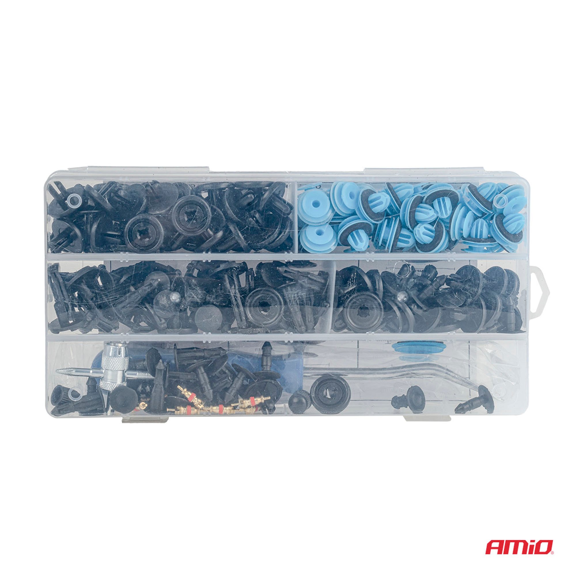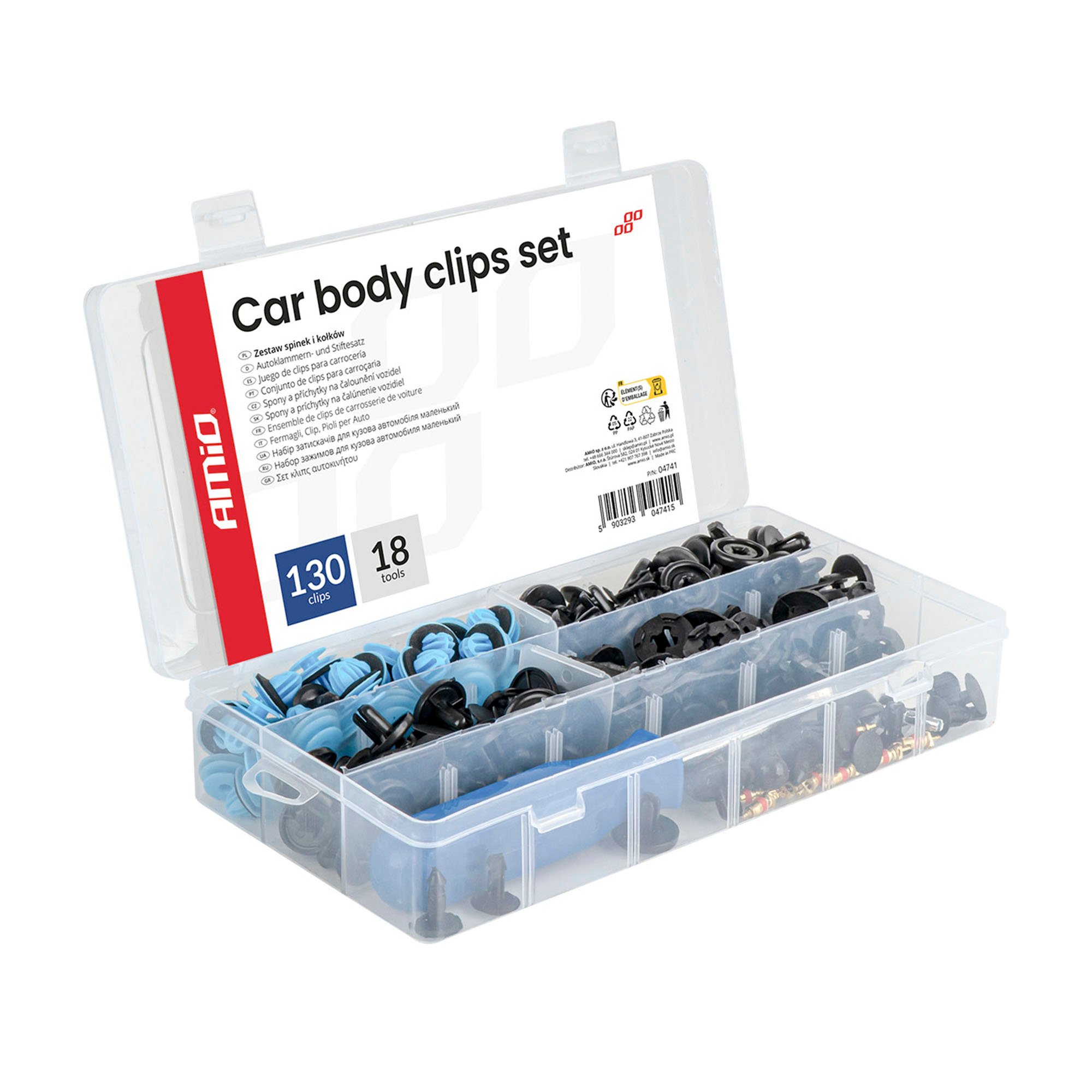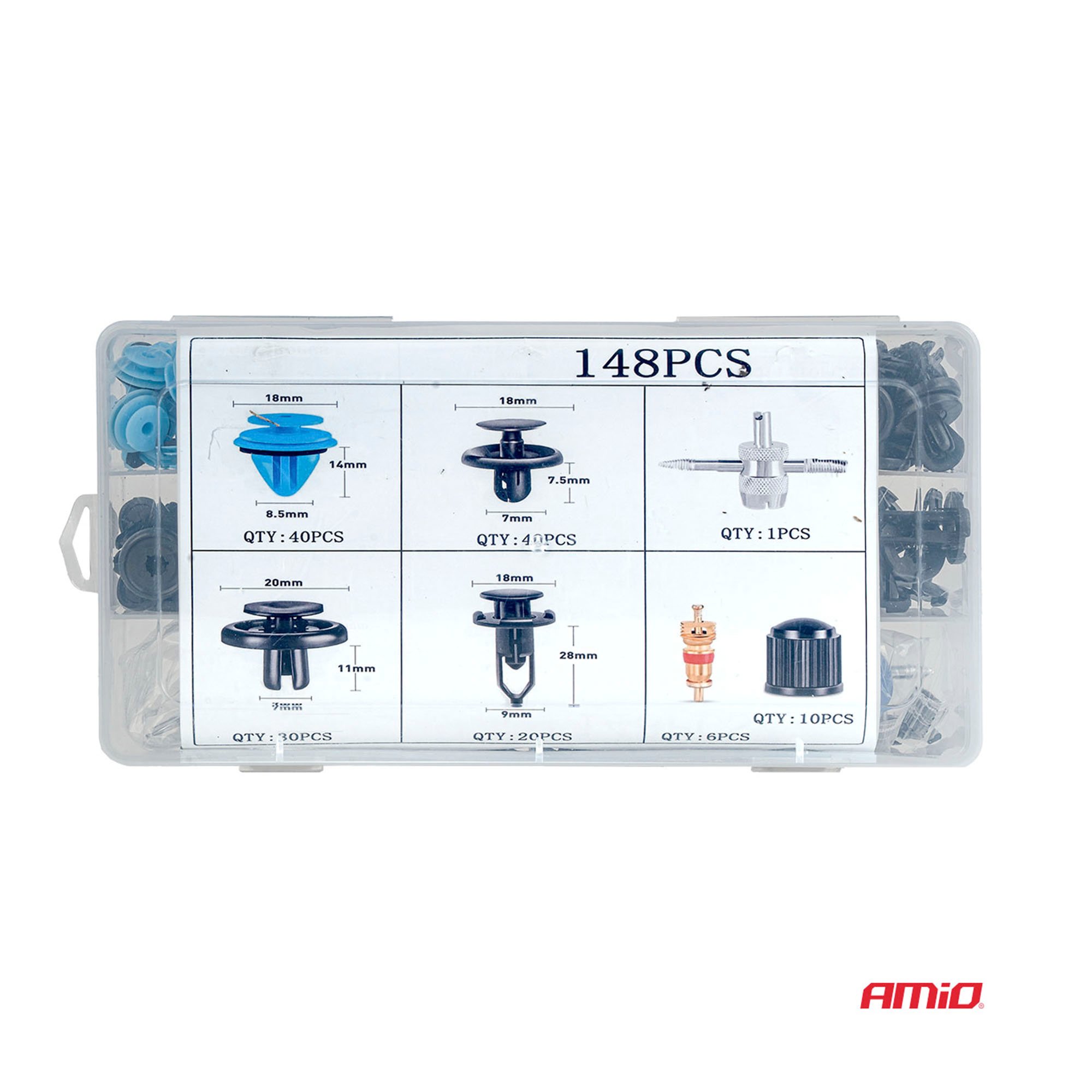 148-osainen auton kiinnikesarja työkaluilla ajoneuvon korin osien asentamiseen, irrottamiseen ja korjaamiseen. Sarja sisältää erilaisia asennustappeja sekä irrotustyökalut, joiden avulla koripaneelien, listojen, verhoilujen ja muovisuojien käsittely onnistuu. Lajitelma auttaa korvaamaan rikkoutuneet tai kuluneet kiinnikkeet.