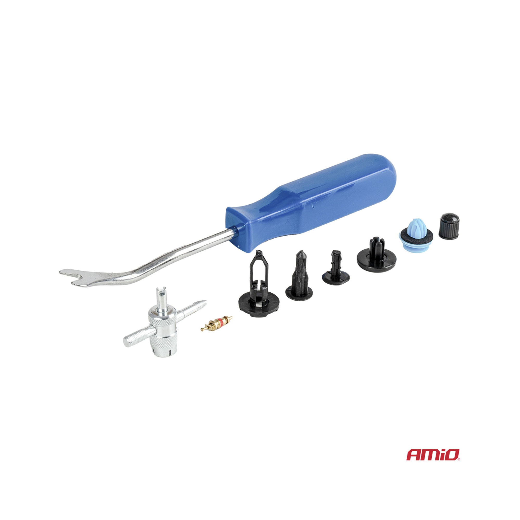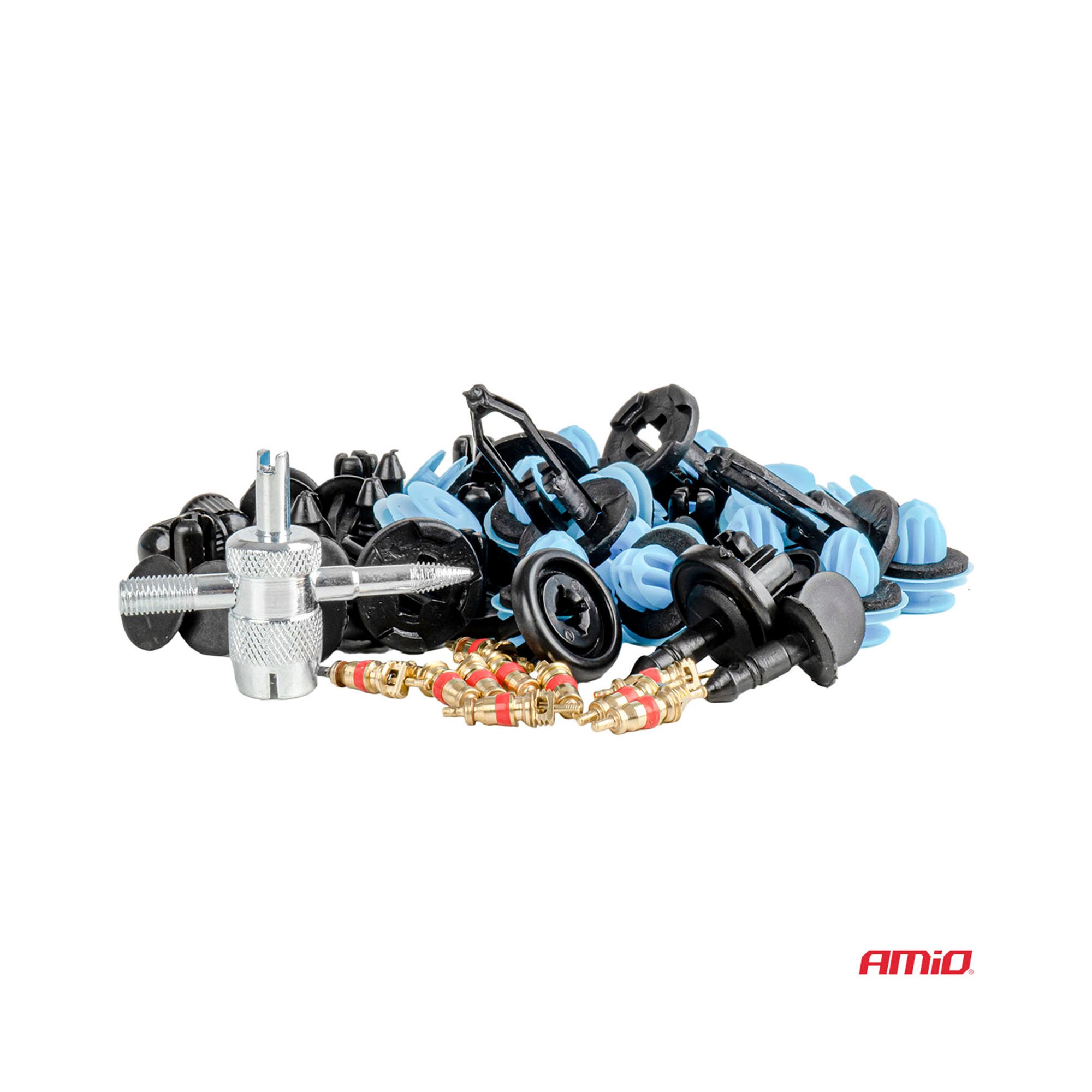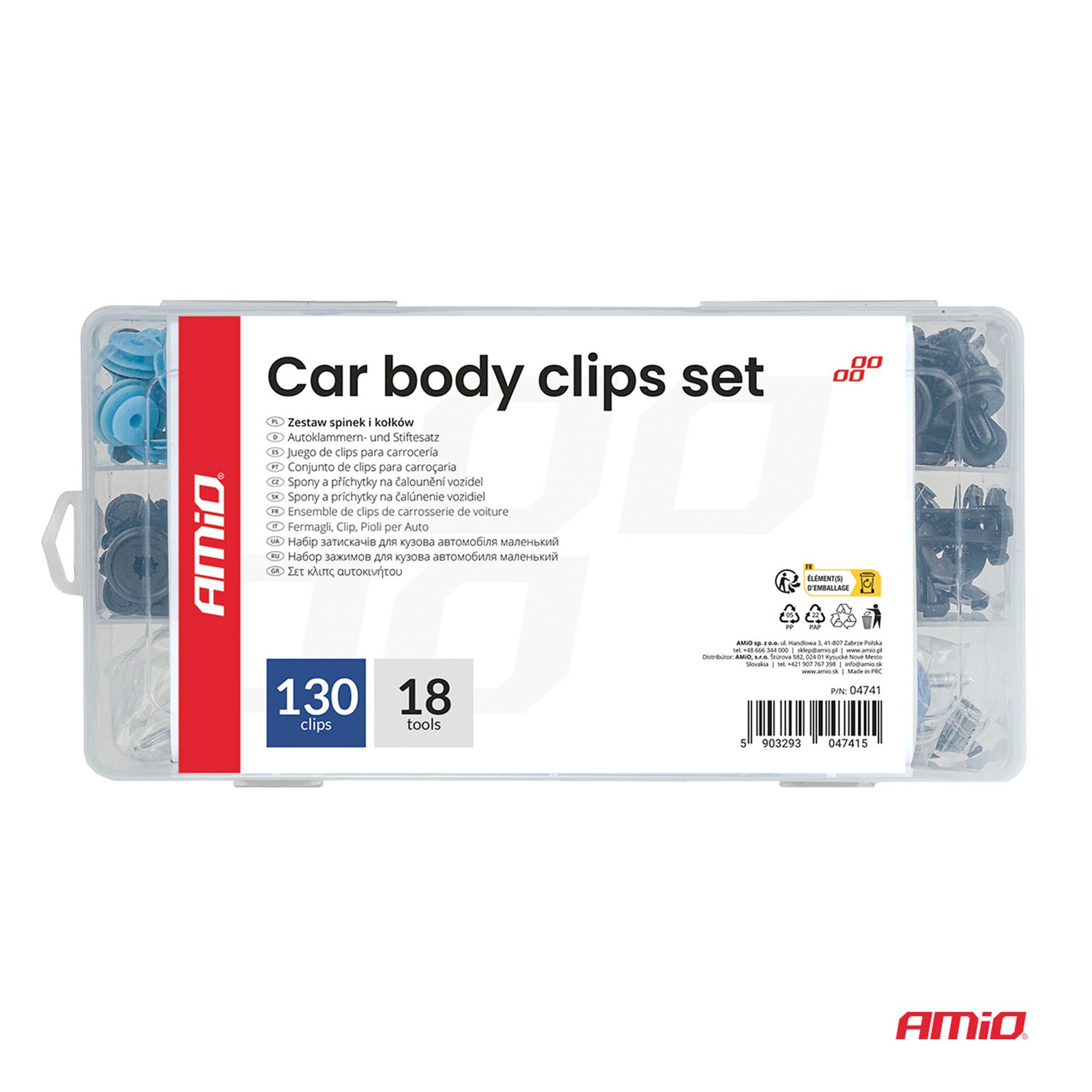 148-osainen auton kiinnikesarja työkaluilla ajoneuvon korin osien asentamiseen, irrottamiseen ja korjaamiseen. Sarja sisältää erilaisia asennustappeja sekä irrotustyökalut, joiden avulla koripaneelien, listojen, verhoilujen ja muovisuojien käsittely onnistuu. Lajitelma auttaa korvaamaan rikkoutuneet tai kuluneet kiinnikkeet.