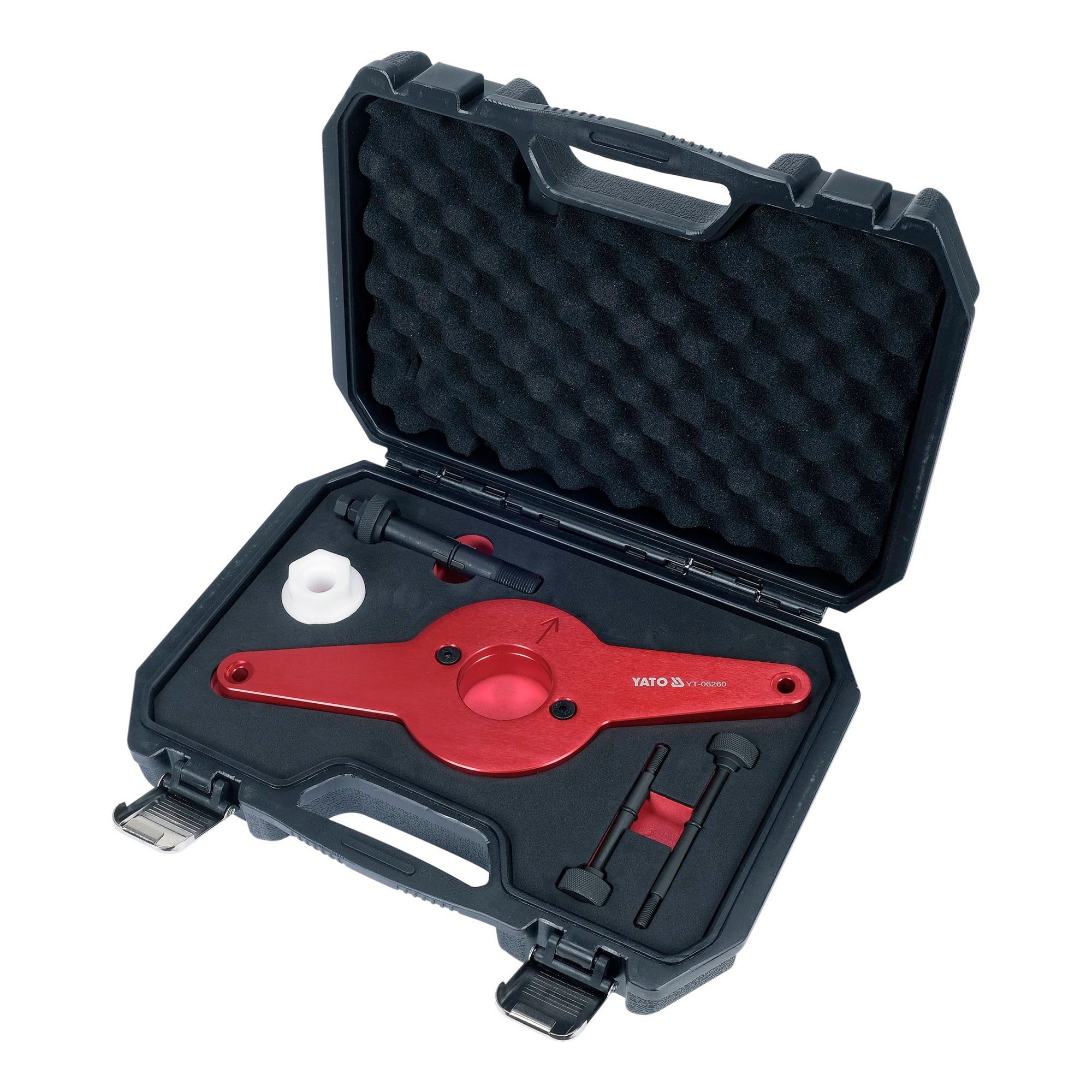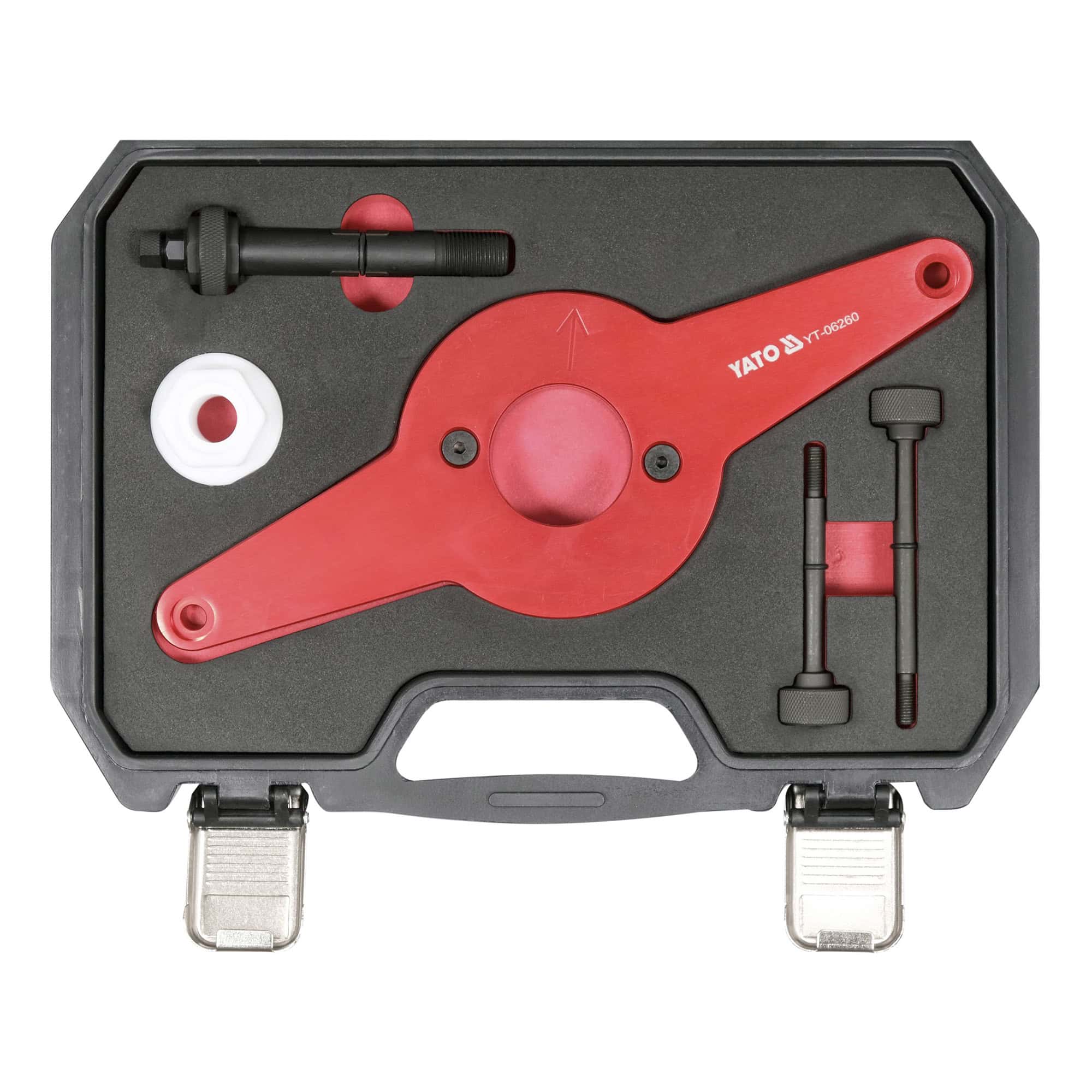 Yato VAG -hihnapyörän kiinnipitotyökalu on ammattitason ratkaisu moottorin kampiakselin värinänvaimentimen asennukseen ja irrotukseen. Viidestä osasta koostuva sarja soveltuu tarkkoihin ja turvallisiin toimenpiteisiin, joissa värinänvaimennin on poistettava tai asennettava ilman vaurioita moottorin osiin. Työkalu pitää kampiakselin hihnapyörän tukevasti paikoillaan, varmistaen moottorin ajoituksen säilymisen purku- ja kokoamisvaiheessa. Työkalu on erityisen tärkeä moottoreissa, joissa jakoketjun hammaspyörässä ei ole kiilauraa, estäen nokka-akselin ajoituksen muuttumisen. Sopii Audi-, Volkswagen-, Seat- ja Škoda-malleihin. Mukana toimitetaan kestävä säilytyskotelo.