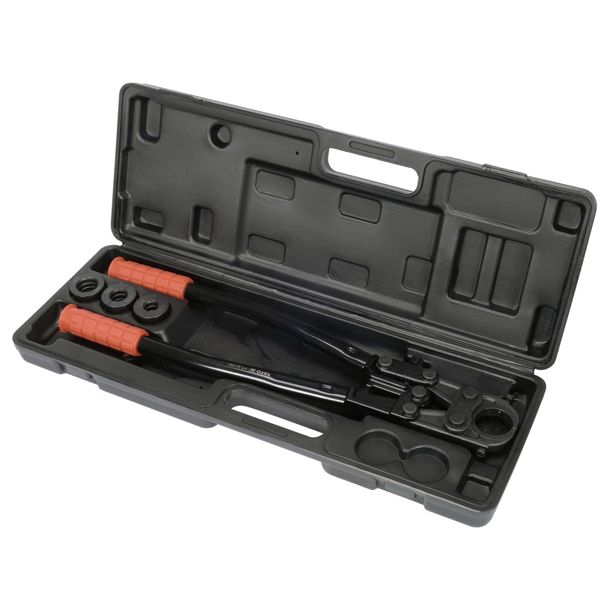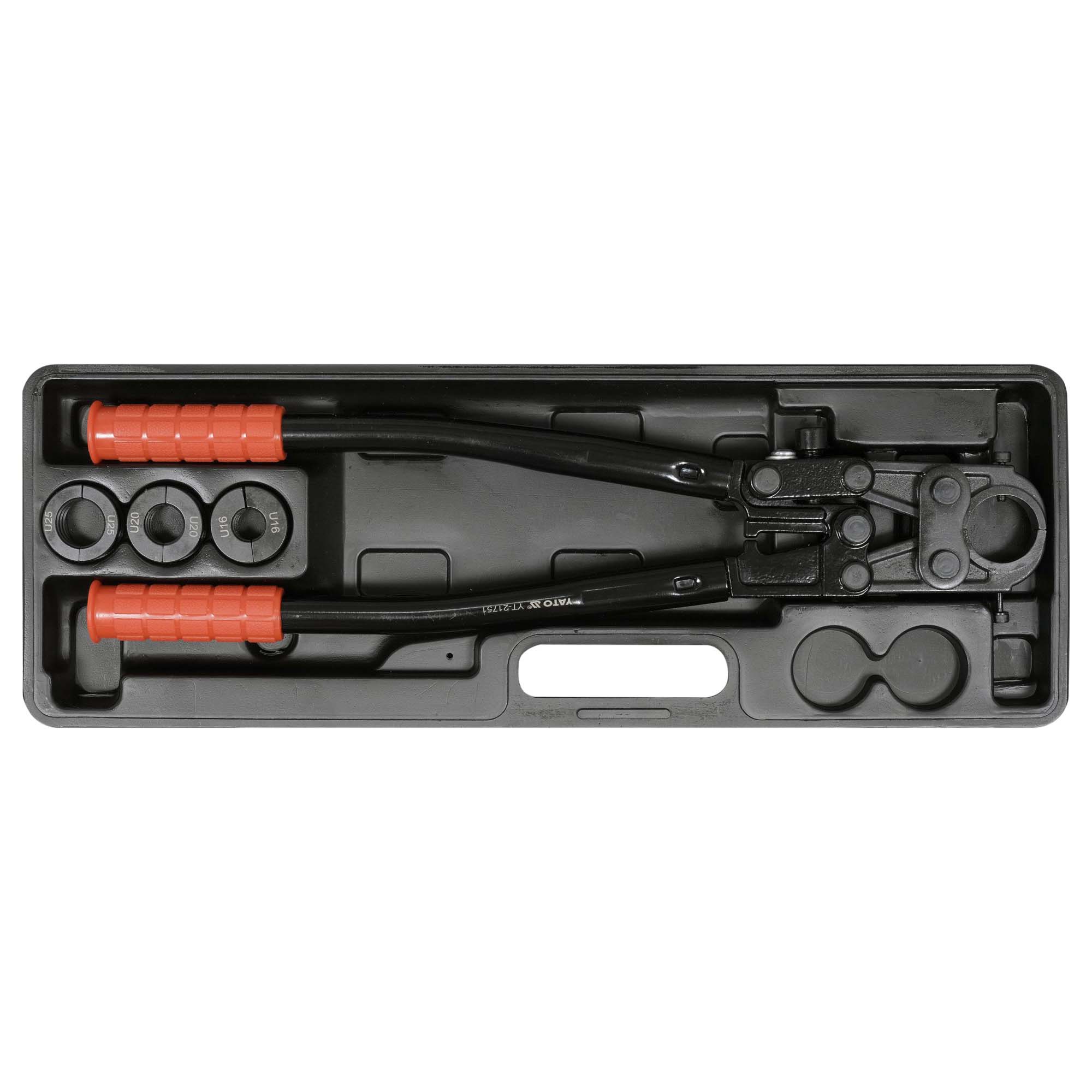 Käsikäyttöinen Yato hydraulinen puristustyökalu PEX-putkille 3 tonnin puristusvoimalla. Puristustyökalun mukana tulee kolme U-tyypin leukaa (16, 20 ja 25 mm).