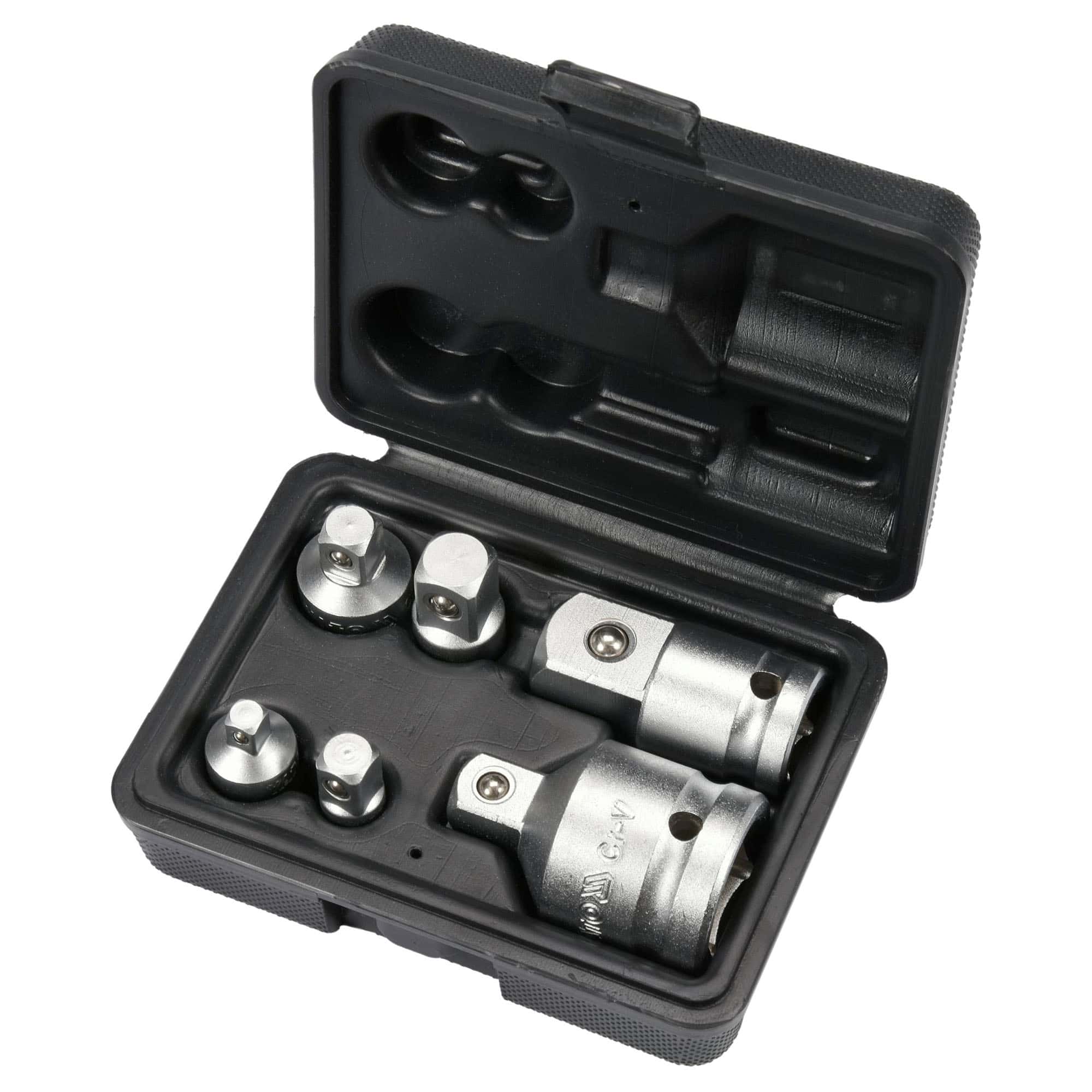 6-osainen adapterisarja, joka tarjoaa monipuolisen ratkaisun erilaisten työkalujen ja liitosten yhteensovittamiseen. Sarja sisältää yleisimmät adapterikoot, joiden avulla voidaan liittää esimerkiksi eri kokoiset räikät, hylsyt ja mutterinvääntimet toisiinsa. Kuljetuskotelo pitää adapterit järjestyksessä.