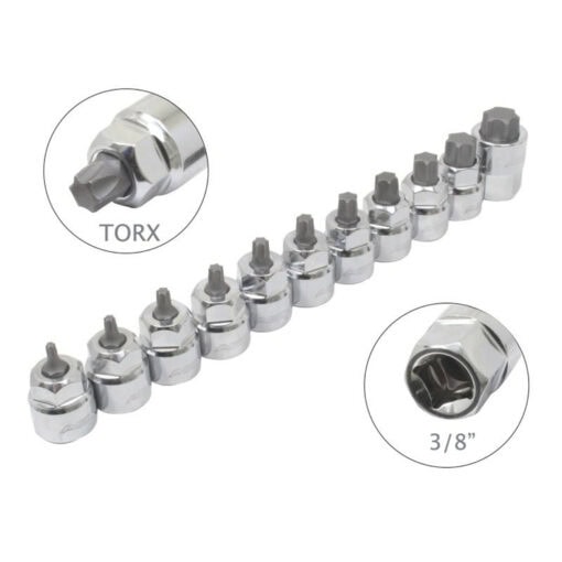 11-osainen matalaprofiilinen TORX hylsysarja 3/8″ on valmistettu kestävästä kromivanadiiniteräksestä (Cr-V), tehokas ja kompakti ratkaisu autohuoltoon, konekorjauksiin ja teollisuuskäyttöön. Koot: T10, T15, T20, T25, T27, T30, T40, T45, T50, T55, T60.