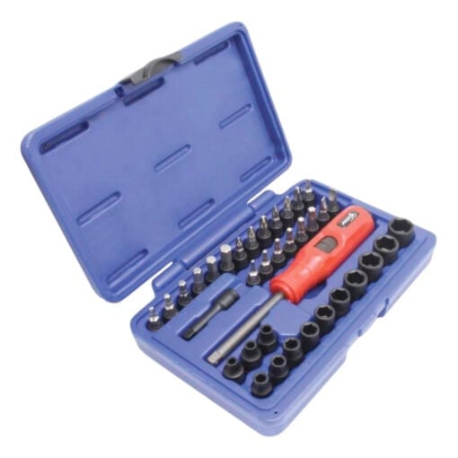 37-osainen iskukärki- ja hylsysarja, joka sisältää kaikki tarvittavat kärjet ja hylsyt erilaisiin ruuvaus- ja kiinnitystehtäviin, aina pienistä kodinkoneista raskaisiin huoltotöihin.
