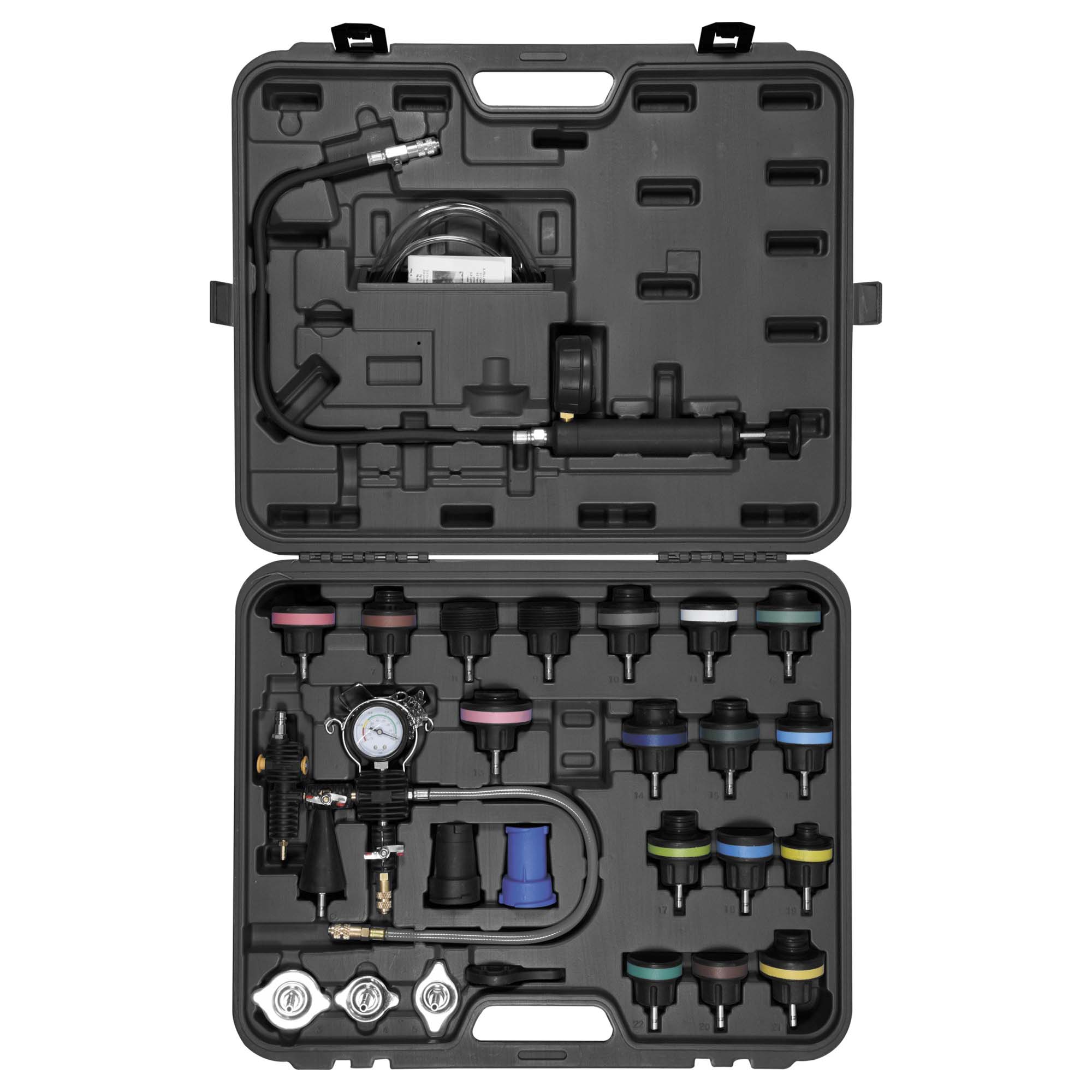 28-osainen jäähdytysjärjestelmän vuodonetsintäsarja autokorjaamojen, huoltopisteiden ja diagnostiikka-asemien vaativaan käyttöön. Sarjan avulla voidaan nopeasti ja tarkasti testata jäähdyttimen sekä koko jäähdytysjärjestelmän tiiviys, paikantaa vuotoja ja suorittaa jäähdytysnesteen vaihtoon liittyviä toimenpiteitä.