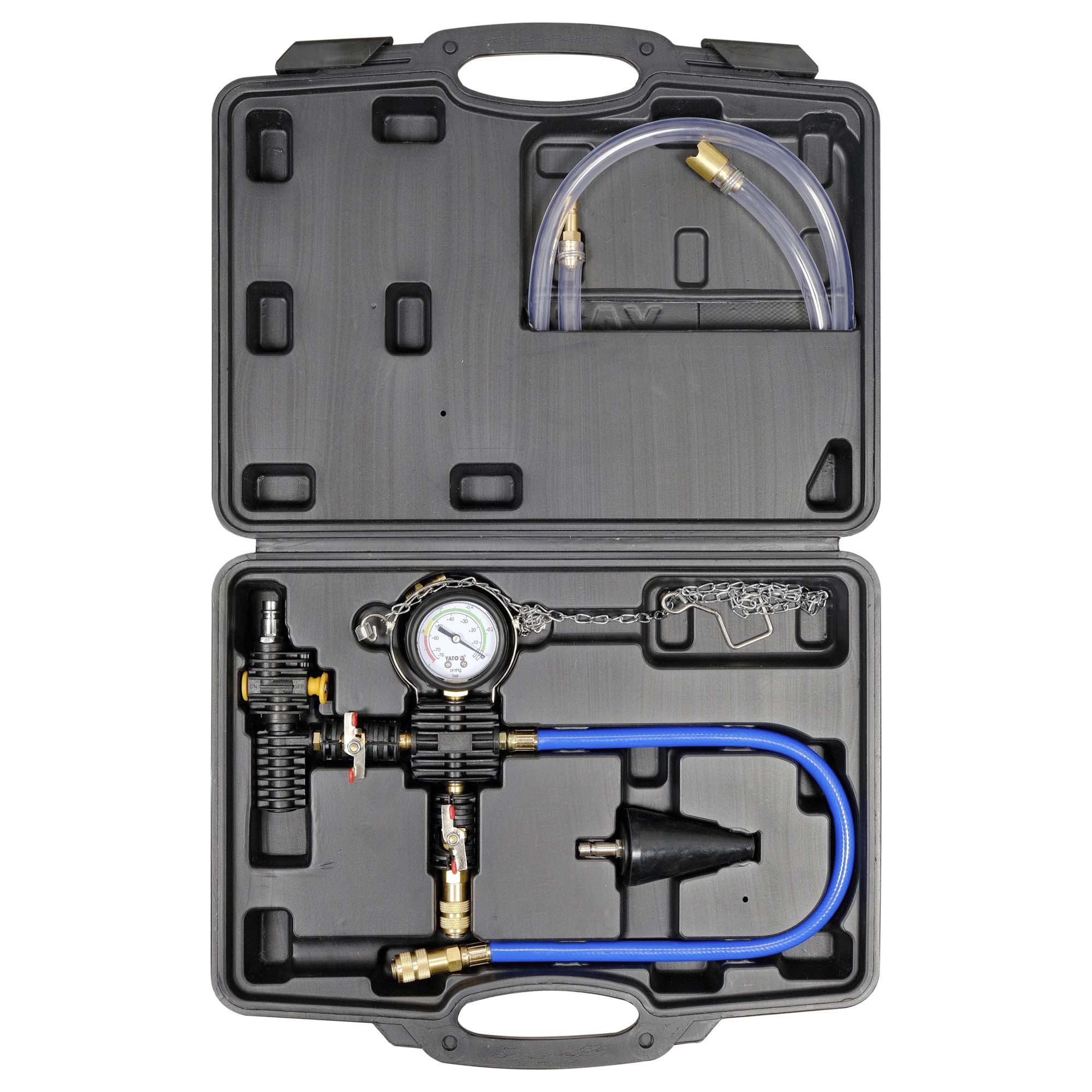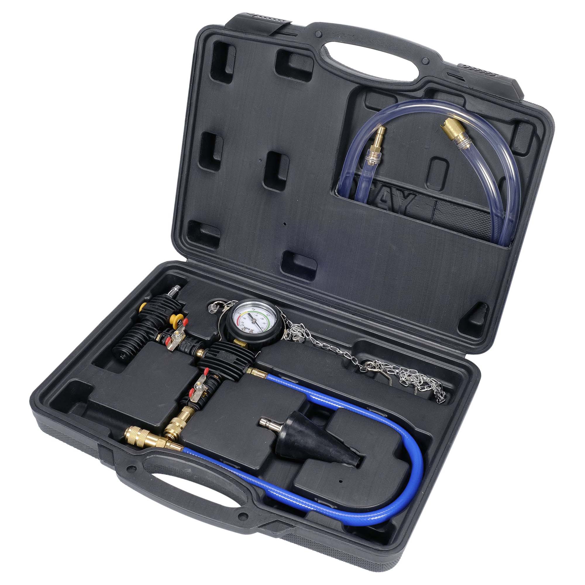 Setti sisältää kestävän painemittarin suojakumikuoressa, syöttöletkun sekä monipuolisesti eri jäähdyttimen kaula- ja täyttöaukkoihin sopivan supistinadapterin.
