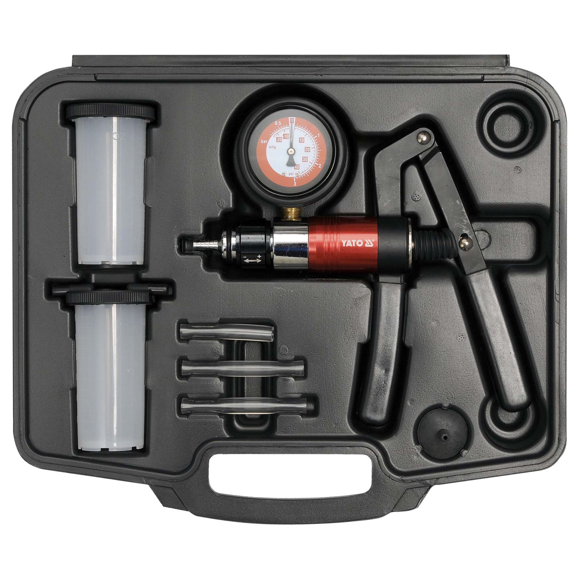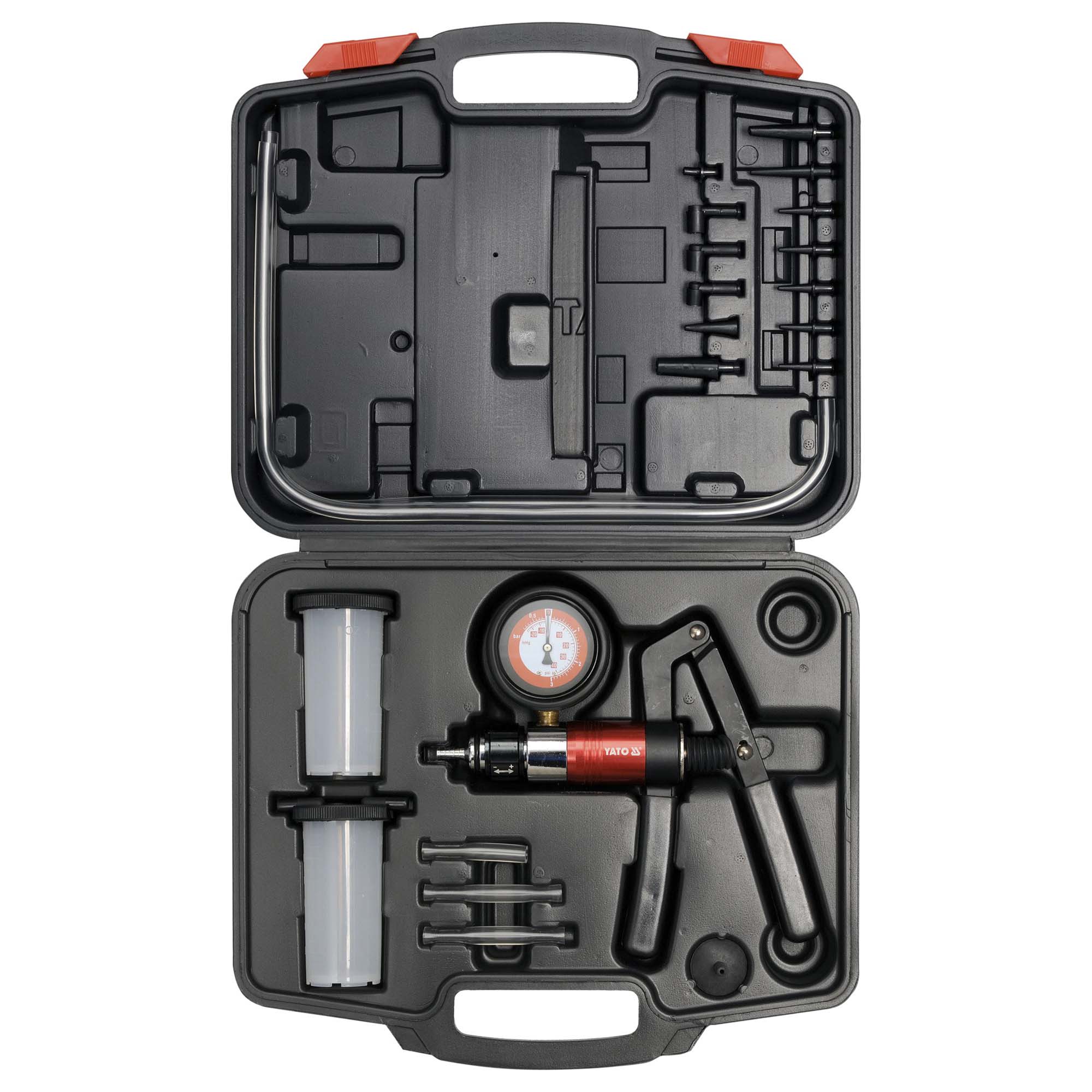 22-osainen Yato käsikäyttöinen jarrujen ilmauslaite / alipainepumppu erilaisten paine- ja tyhjiöpohjaisten autojärjestelmien diagnosointiin, kuten EGR-, MAP-, jarru- ja polttoainejärjestelmien testaukseen.