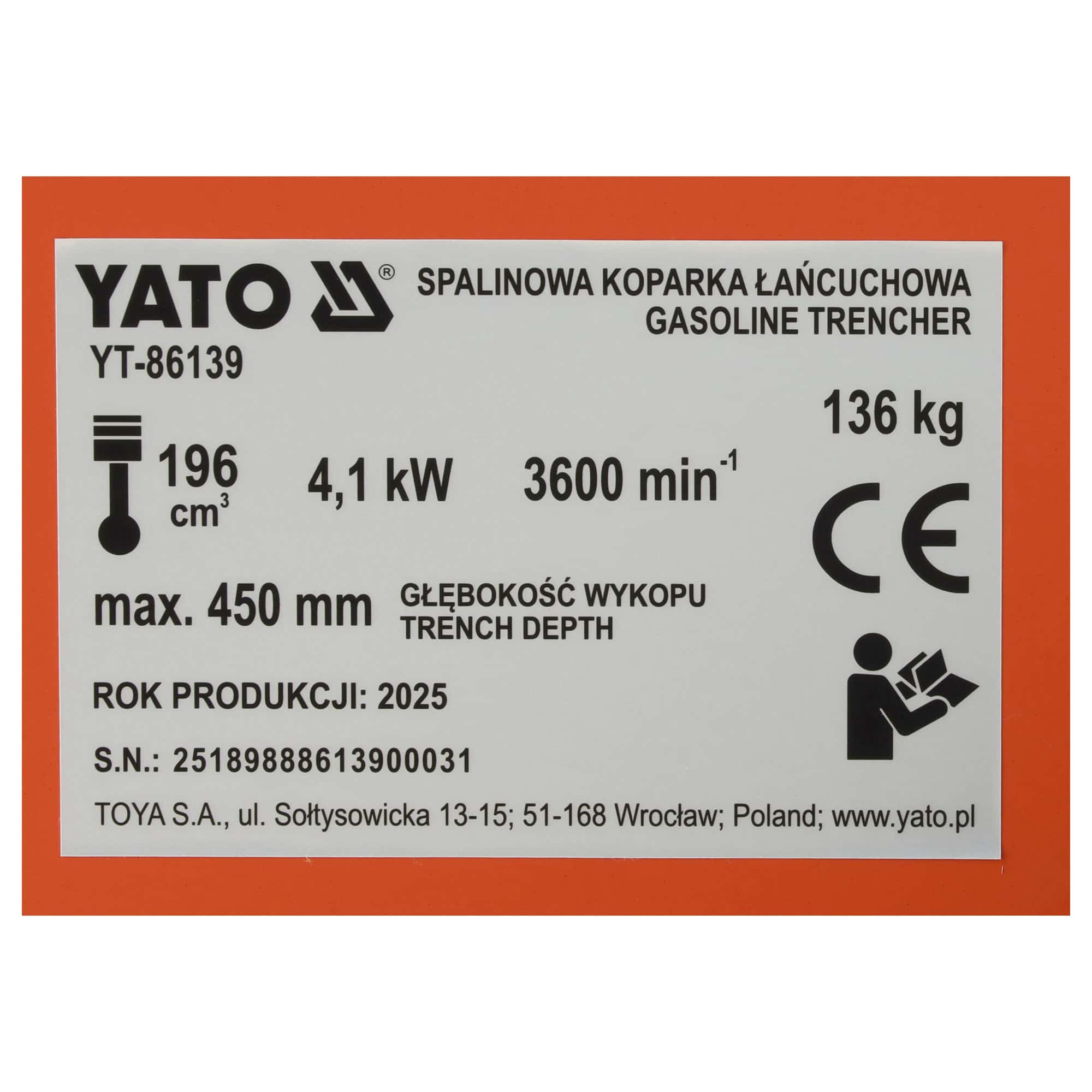 Bensiinikäyttöinen Yato ketjukaivuri 6,5 hv Loncin-moottorilla soveltuu kapeiden, tarkkojen kaivantojen tekemiseen esimerkiksi kaapelointeihin ja kastelujärjestelmiin. Laite mahdollistaa siistin ja tasaisen kaivuujäljen, joka helpottaa viimeistelytyötä ja estää maaperän turhan vaurioitumisen.
