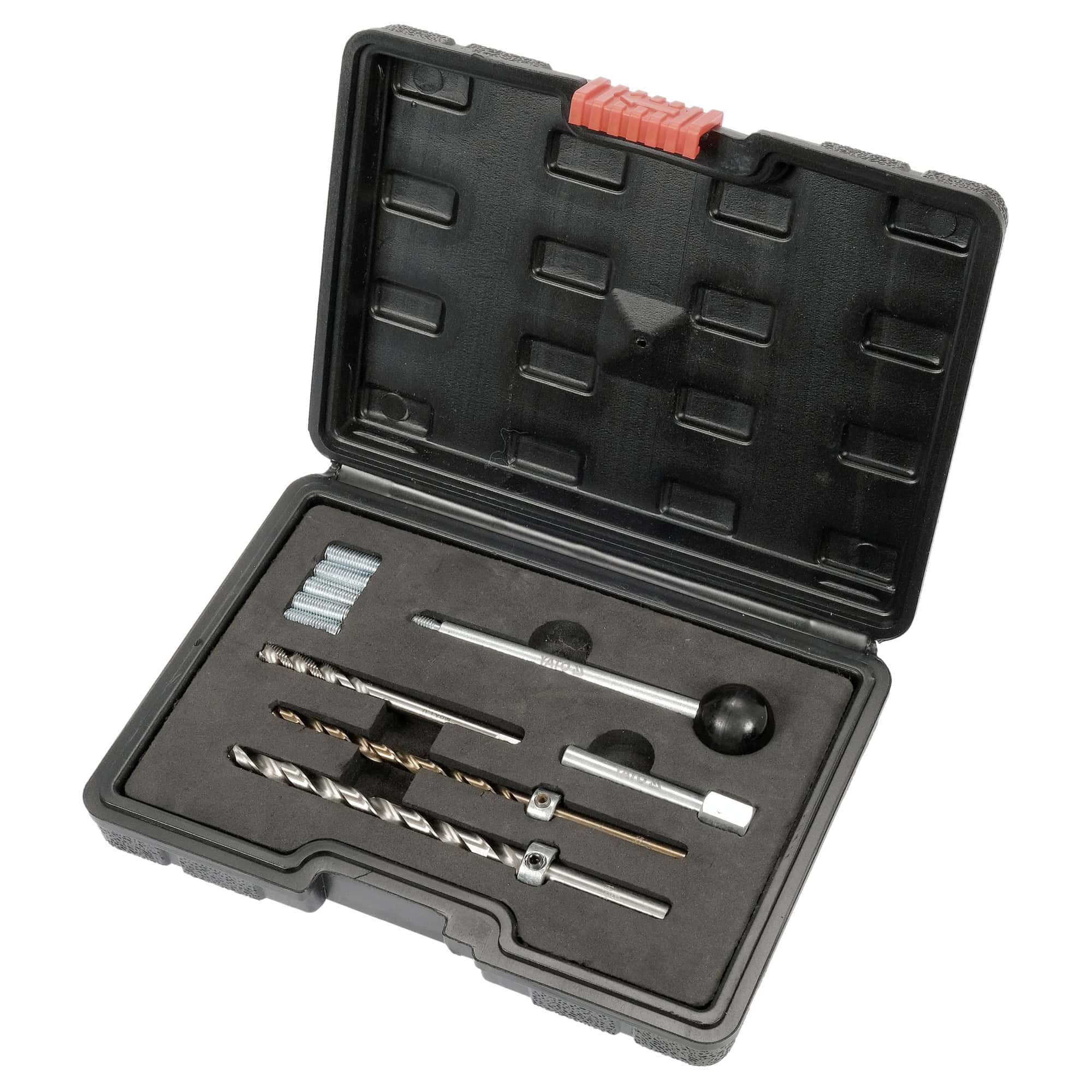 10-osainen Yato kierteen korjaussarja Mercedes-Benz-ajoneuvojen suuttimien M6 × 1 -kiinnityskierteiden korjaamiseen. Sarja sisältää kierreholkit, poranterät pysäyttimillä sekä kierretapin korjaustyötä varten.