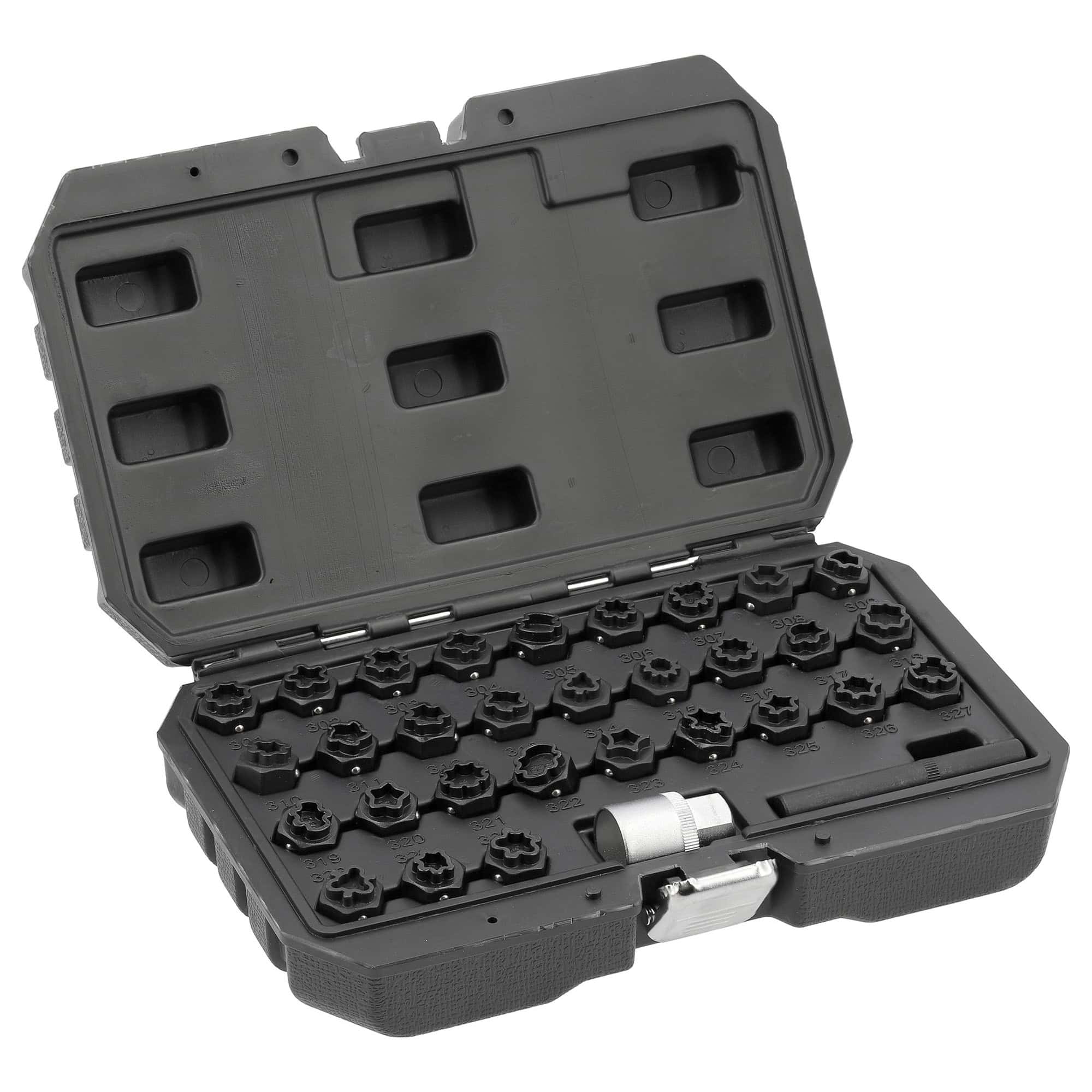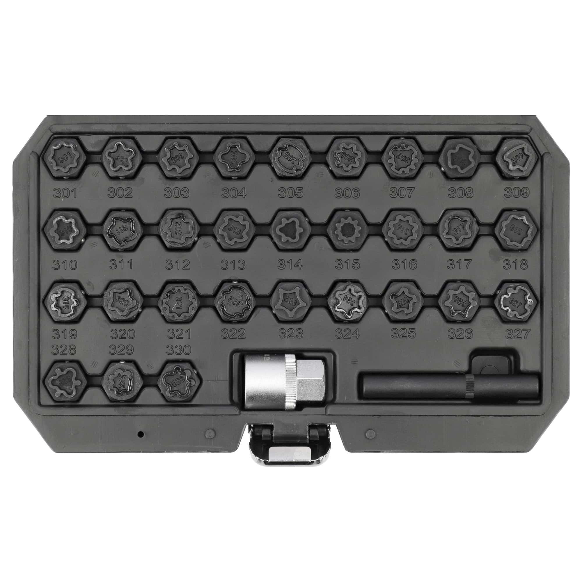 Ammattitason hylsysarja Mercedes-ajoneuvojen lukkopulteille. Setti kattaa yleiset Mercedes-profiilit, mikä helpottaa huolto- ja rengastöitä korjaamoissa sekä renkaiden asennuspisteissä.