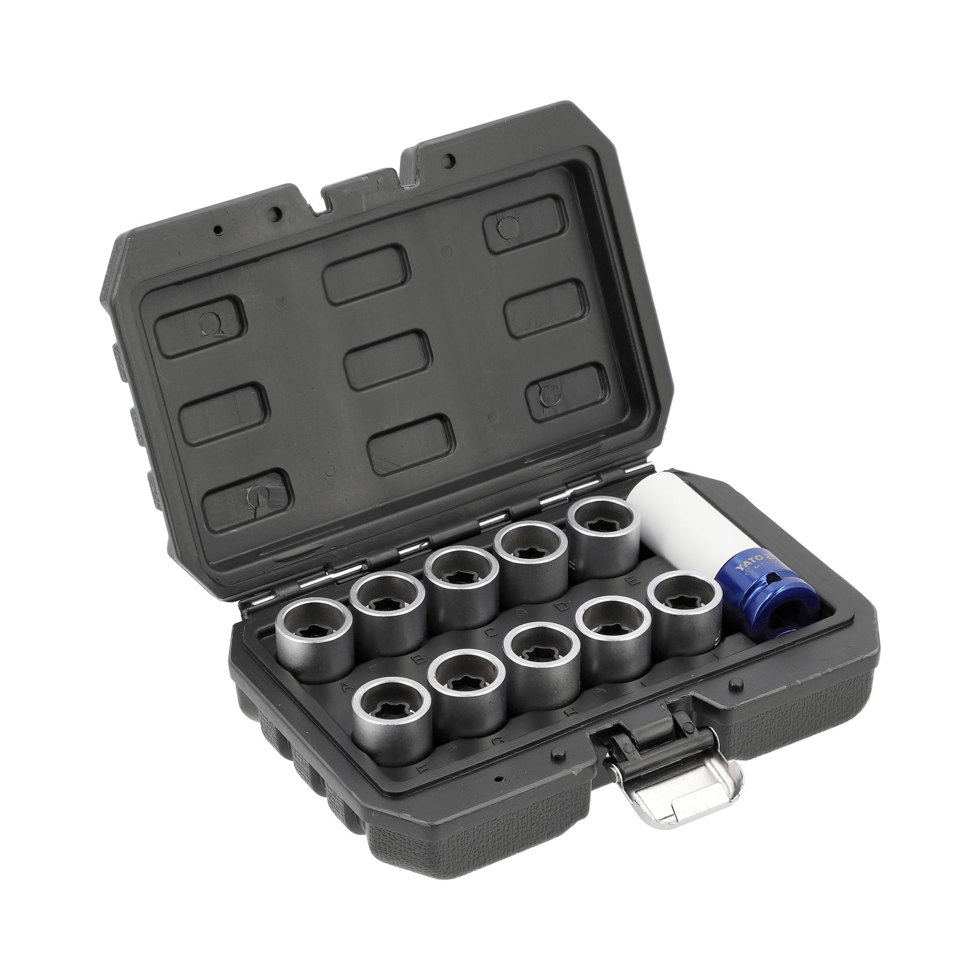 Toyota-ajoneuvoille suunniteltu pyöränlukkomutterihylsysarja lukkopulttien avaamiseen ja huoltamiseen. Sarja sisältää 10 erikoishylsyä eri lukkomutterimalleille sekä 17 mm iskuhylsyn. Hylsy on varustettu reunasuojalla vanteiden naarmuuntumisen estämiseksi.