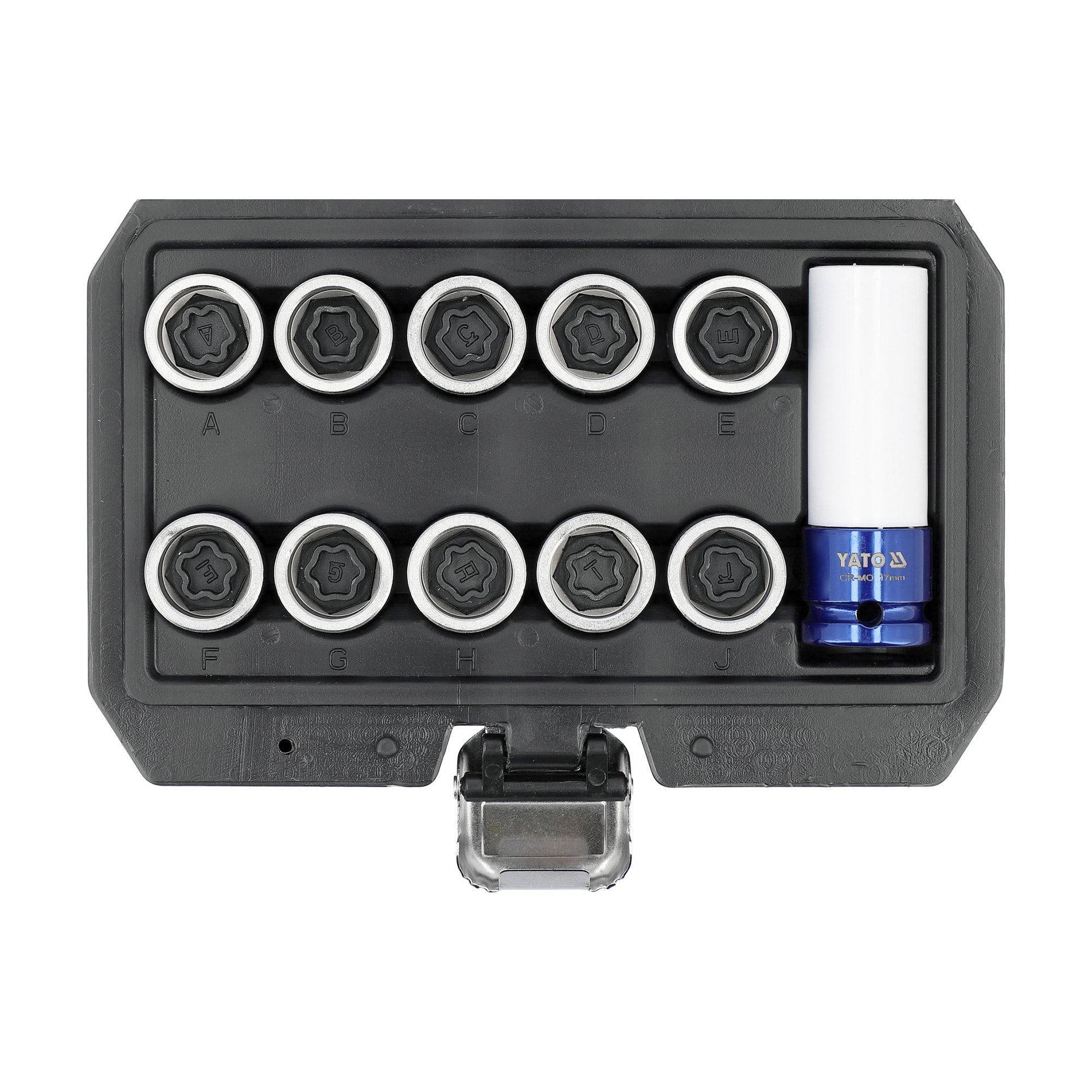 Toyota-ajoneuvoille tarkoitettu 11-osainen lukkopultti avainsarja / hylsysarja avaa lukkomutterit tehokkaasti kestävien CrV- ja CrMo-hylsyjen avulla.