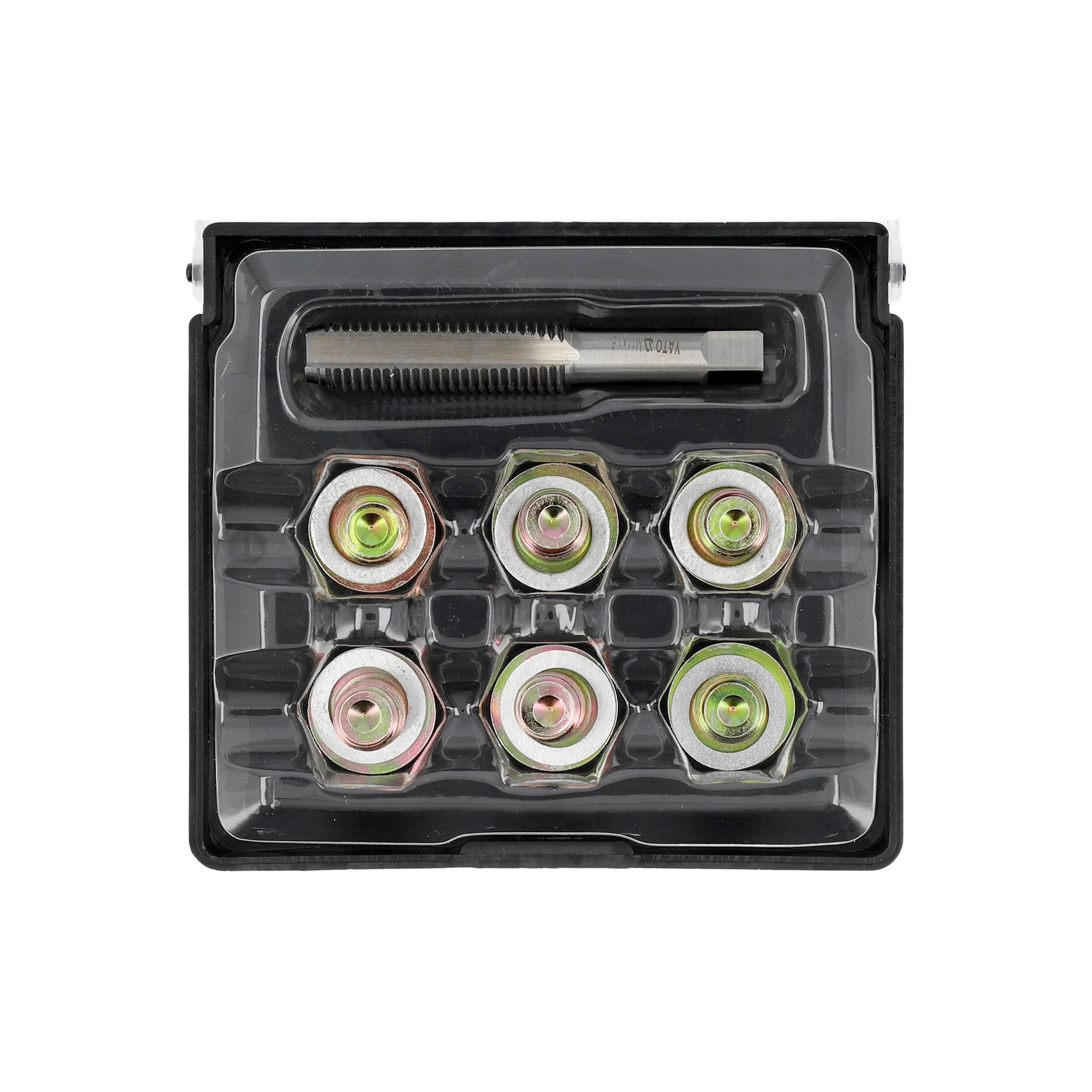 M11 x 1,5 -öljypohjan kierrekorjaussarja vaurioituneiden tyhjennystulppien kierteiden kunnostamiseen. Sarja sopii useimpiin henkilö- ja hyötyajoneuvoihin, joissa käytetään yleisiä kierrestandardeja. Sarjassa mukana oleva kierretappi mahdollistaa uuden, tarkan kierreaukon tekemisen, ja kuusi A3-teräksestä valmistettua öljytulppaa varmistavat kestävän ja tiiviin lopputuloksen. Alumiiniset tiivistysprikat antavat luotettavan tiivistyksen, mikä ehkäisee öljyvuodot.