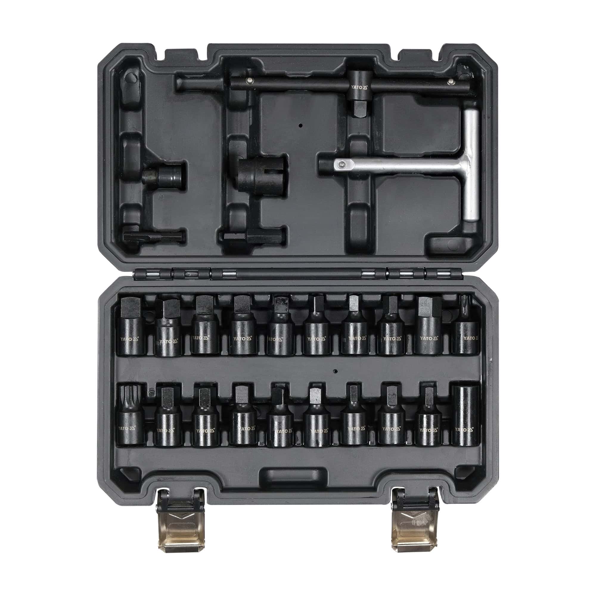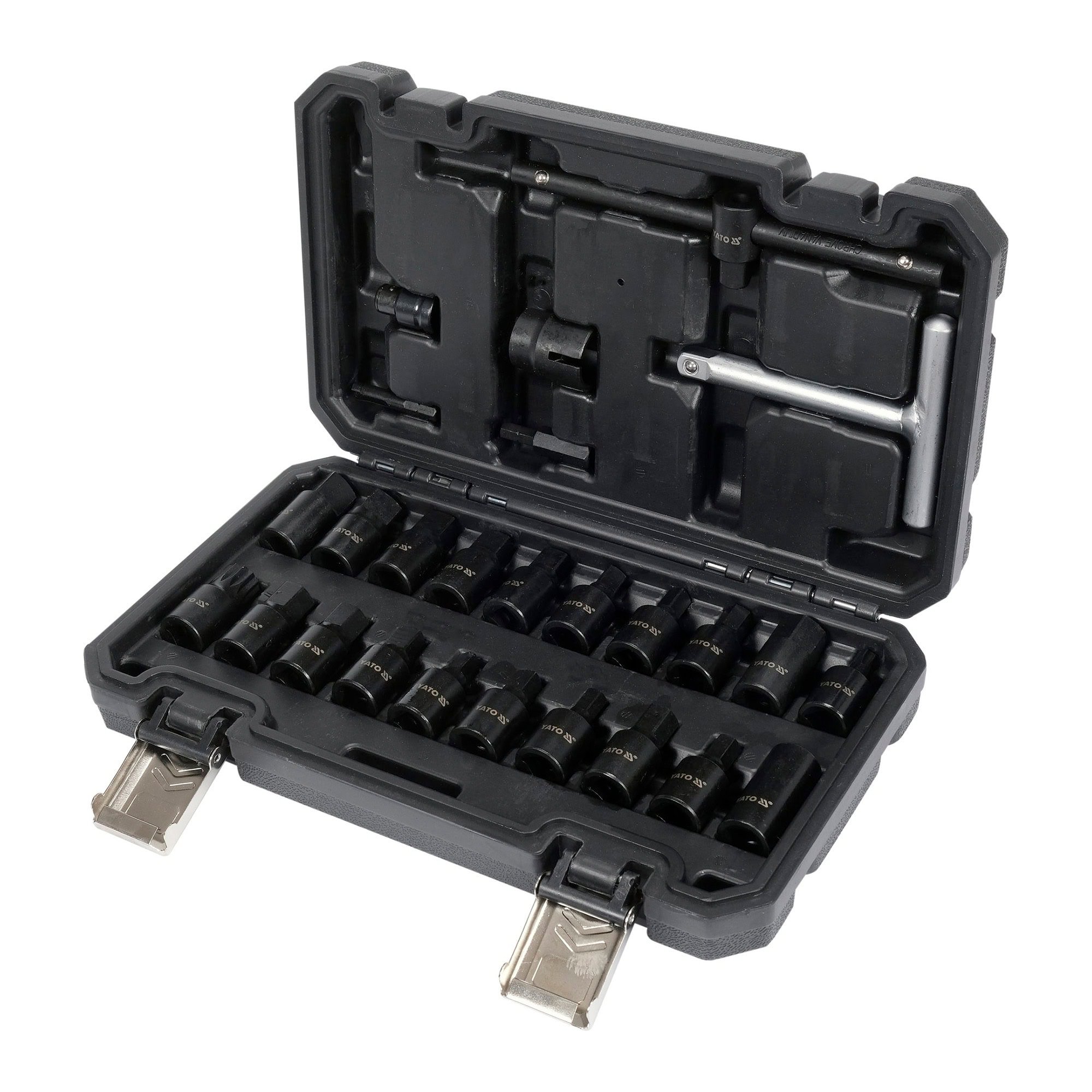 26-osainen Yato öljytulppa avainsarja sisältää useita kuusio-, neliö-, Torx-, spline- ja erikoiskärkiä sekä T-kahvat ja adapterit. Sarja sopii useimpien autojen öljytulppien irrotukseen ja kiristykseen, myös paineilmatyökaluilla käytettäväksi.