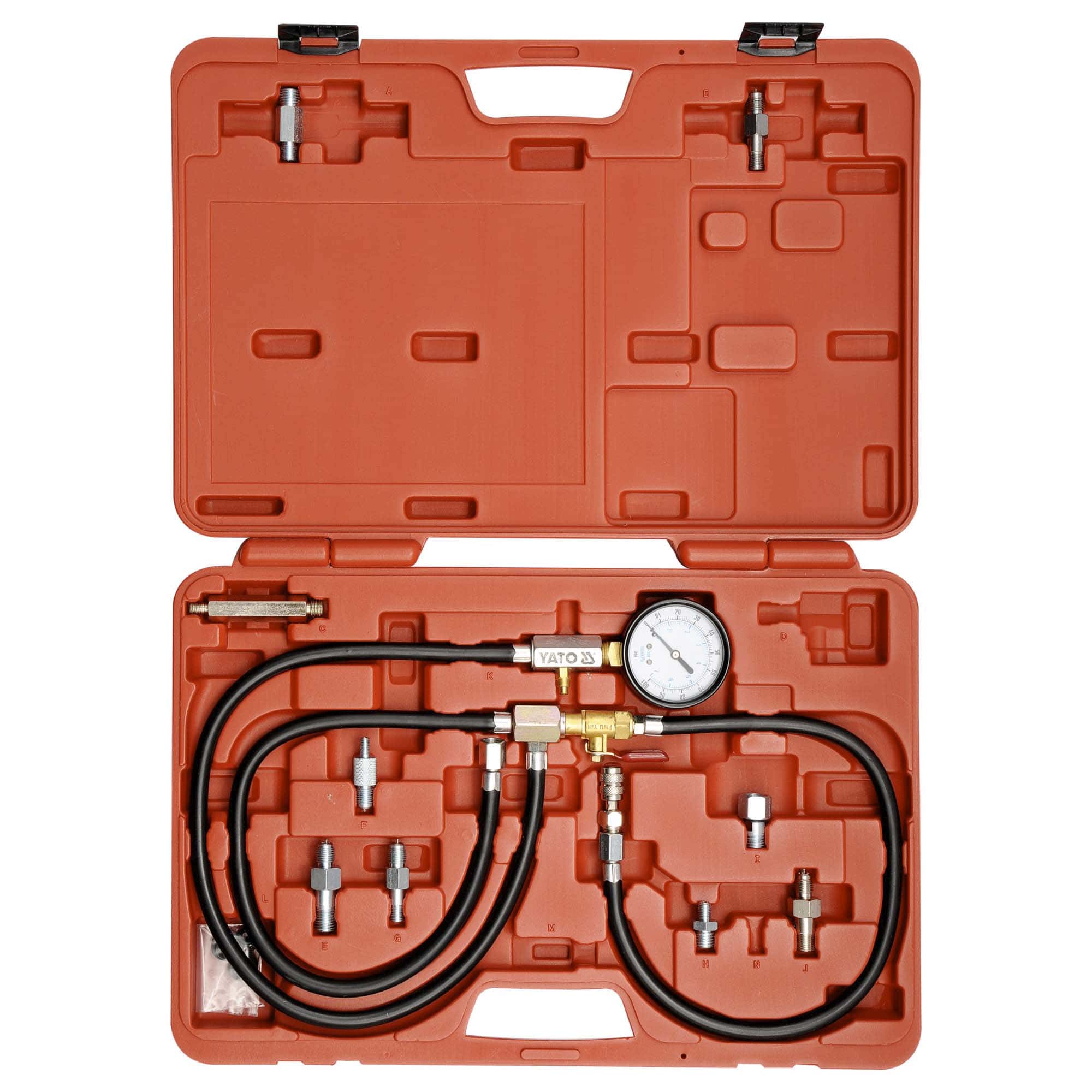 Polttoaineen ruiskutuksen testisarja polttoainejärjestelmän kunnon tarkistamiseen ja vianmääritykseen. Sarjan avulla voidaan mitata polttoaineen paine tarkasti, mikä helpottaa ruiskutusjärjestelmän toiminnan arviointia ja mahdollisten vikojen paikantamista.