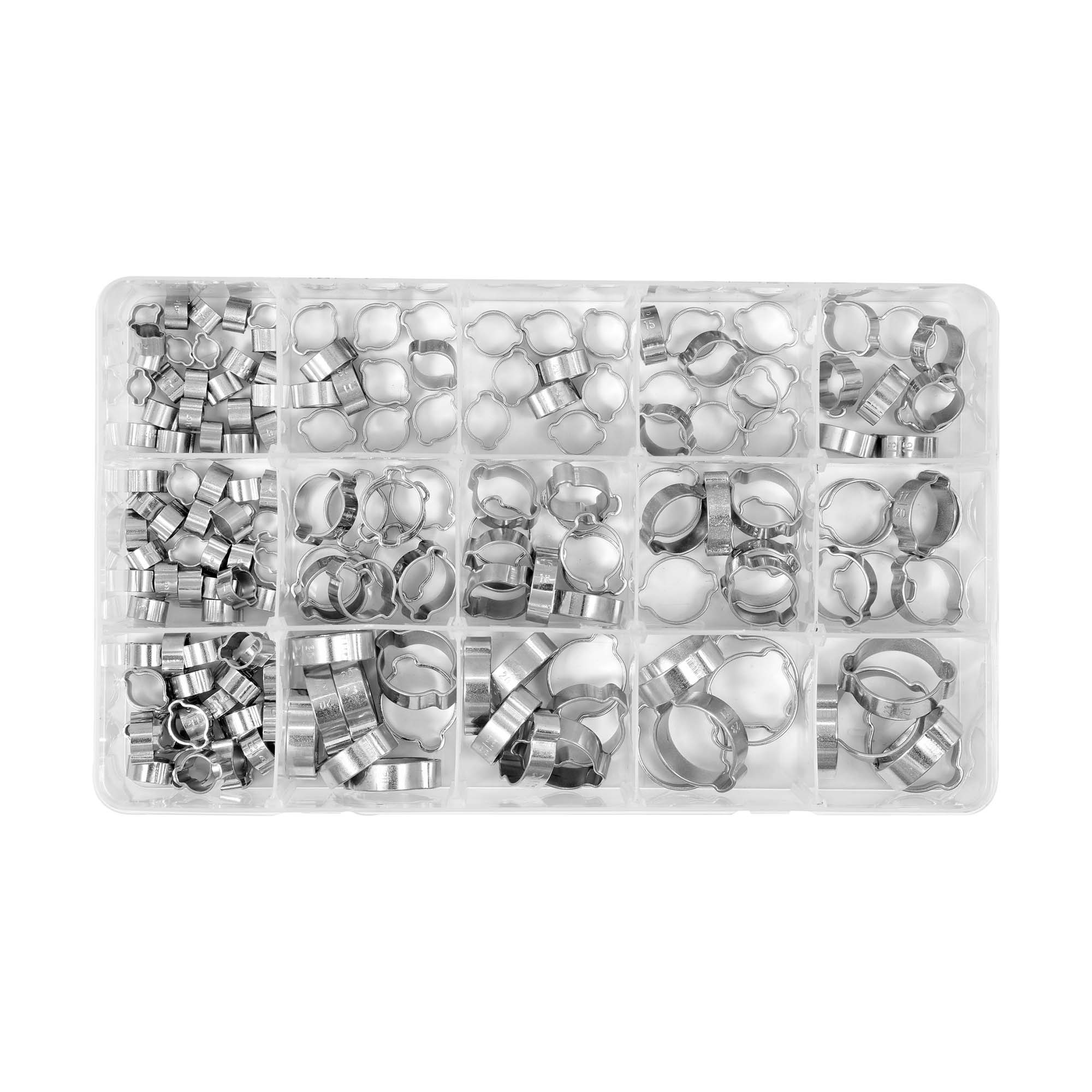 Kattava 175-osainen kaksoiskorvallisten letkunkiristimien lajitelma. Kiristimet on valmistettu sinkitystä hiiliteräksestä, joka kestää hyvin korroosiota.