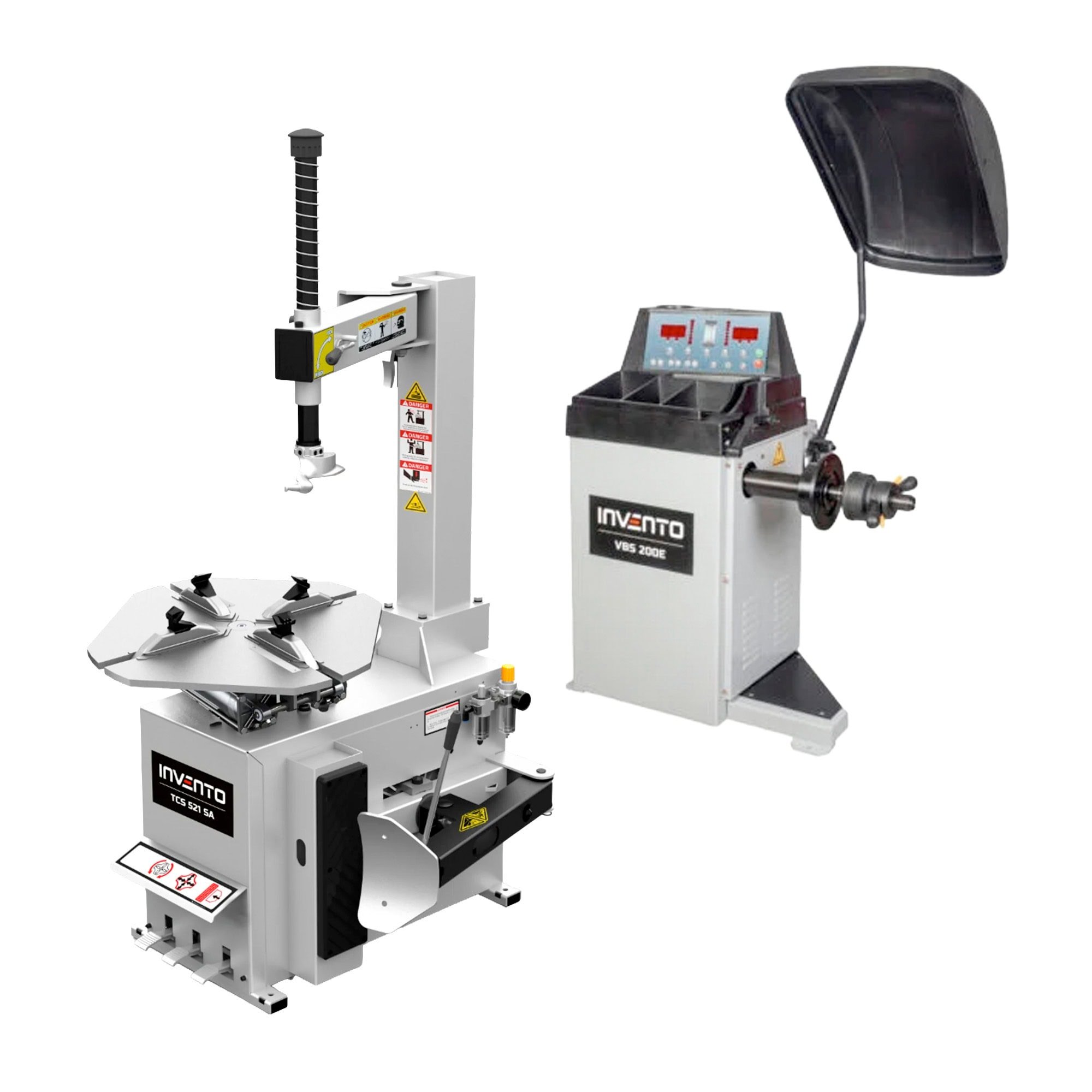 Invento rengaskone ja tasapainotuskone -paketti renkaiden vaihtoon ja tasapainotukseen. Paineilmatoiminen rengaskone kääntyvällä puomilla soveltuu 10–21″ vanteille. Tasapainotuskone sopii 10–28″ vanteille, sisältää neljä ohjelmaa ja LED-näytön.