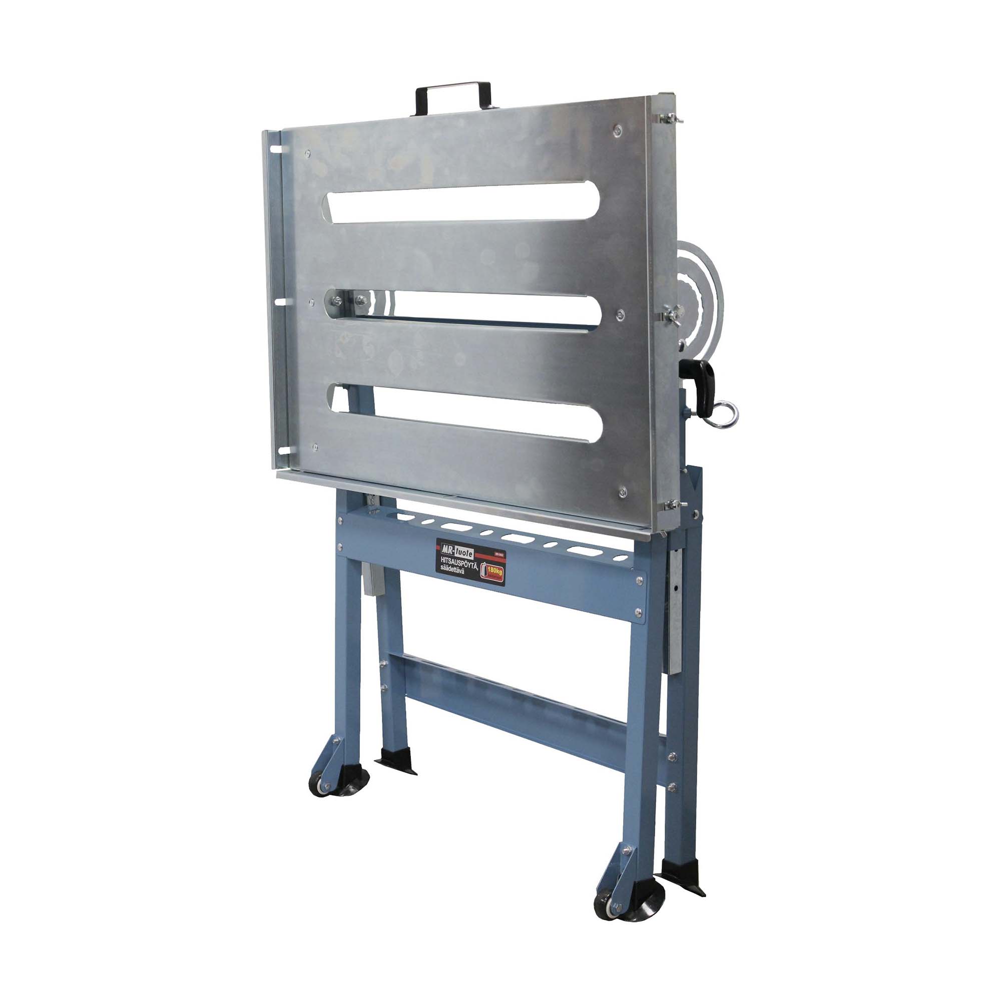 Säädettävä työskentelyalusta hitsaus- ja metallitöihin. Kokoon taittuva pöytä on helppo kuljettaa mukana työmaalle tai siirtää eri työpisteiden välillä. Pöydässä on pienet pyörät sekä vetokahva liikuttamista ja säilytystä varten.