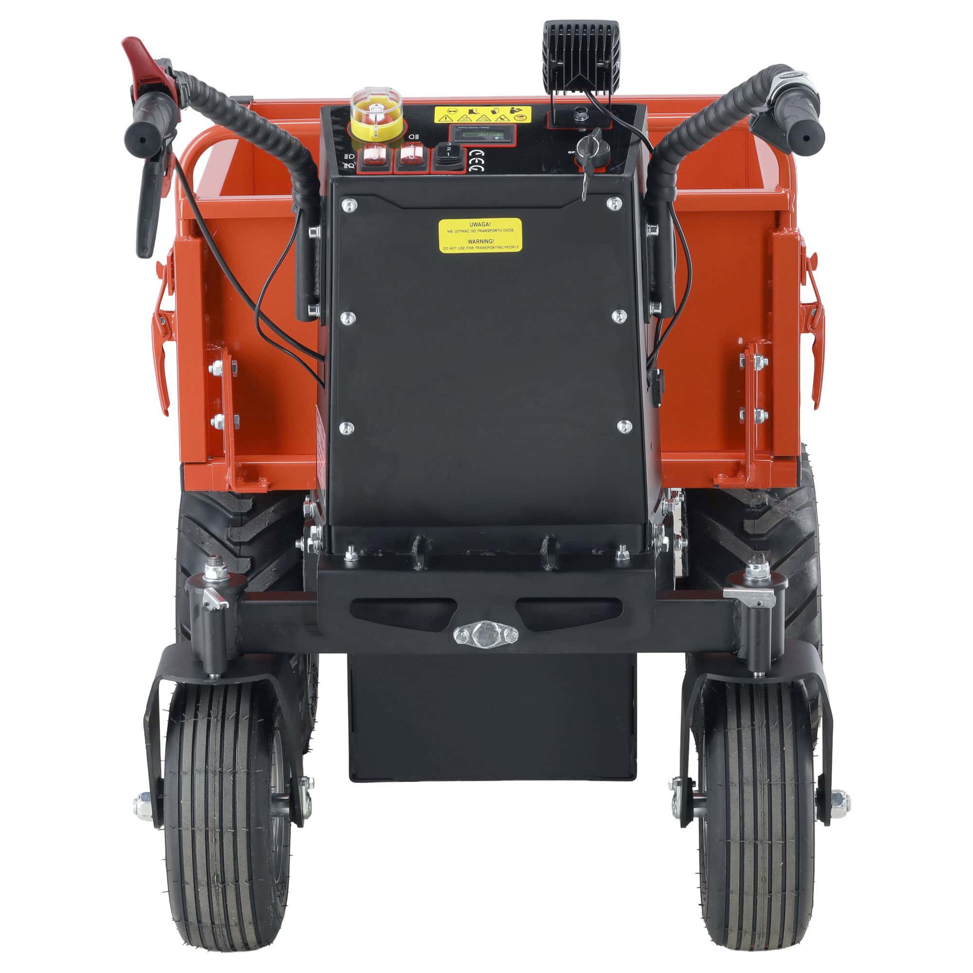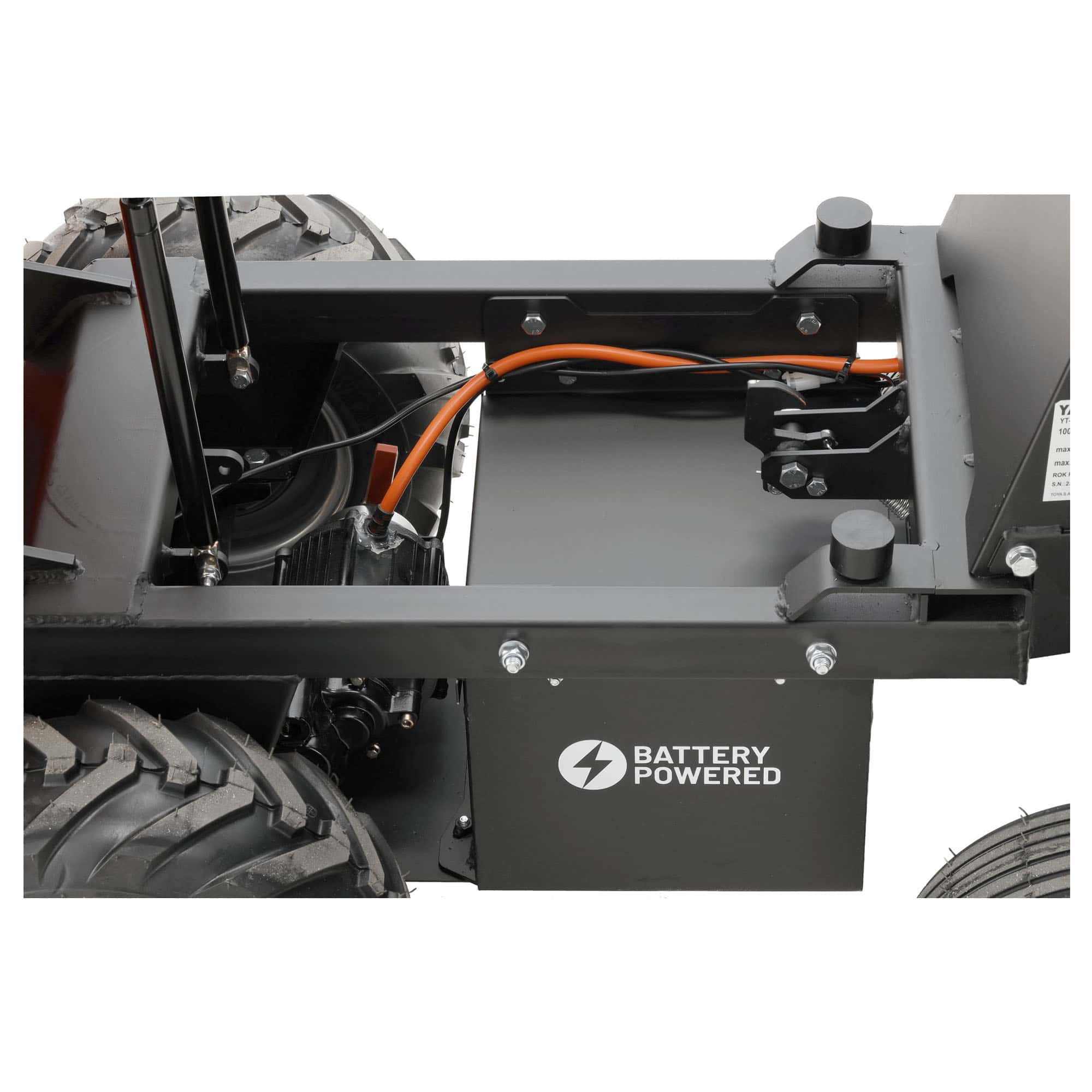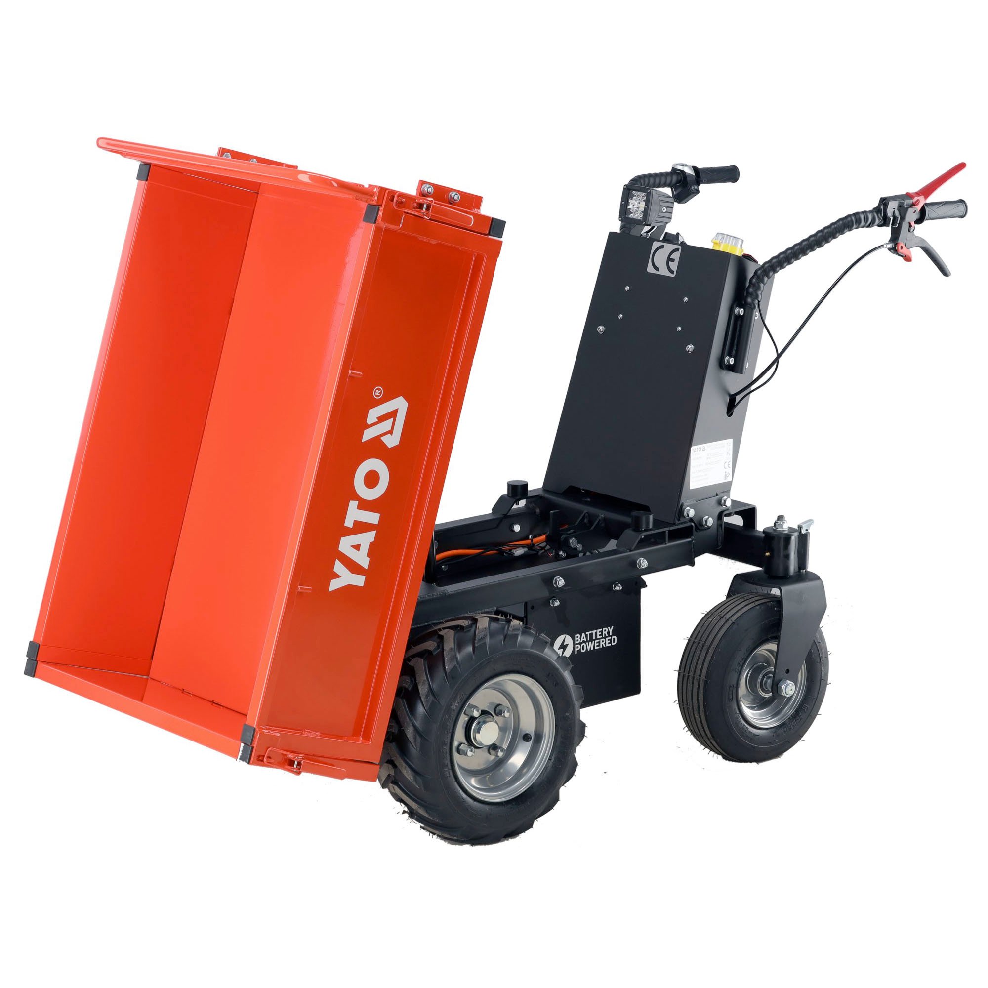 Yato sähkökäyttöinen dumppperi raskaiden kuormien siirtämiseen esimerkiksi työmailla, maatiloilla ja puutarhoissa.