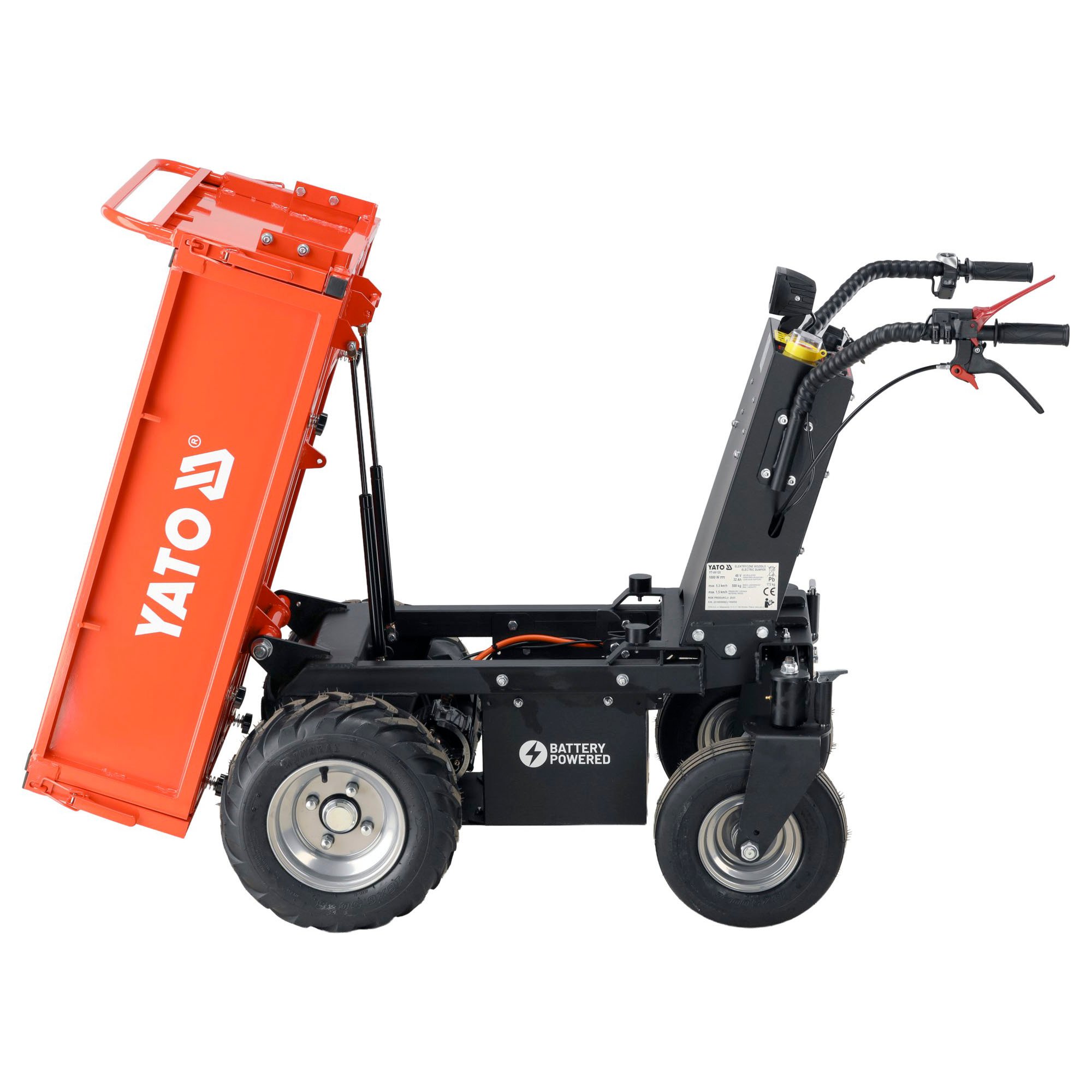 Yato sähkökäyttöinen minidumpperi, joka soveltuu jopa 500 kg kuormien siirtämiseen työmailla, maatiloilla ja puutarhoissa. Minidumpperissa on kolmelta sivulta avattava lava, jonka laidat voidaan irrottaa suurempien ja erimuotoisten kuormien kuljettamista varten.