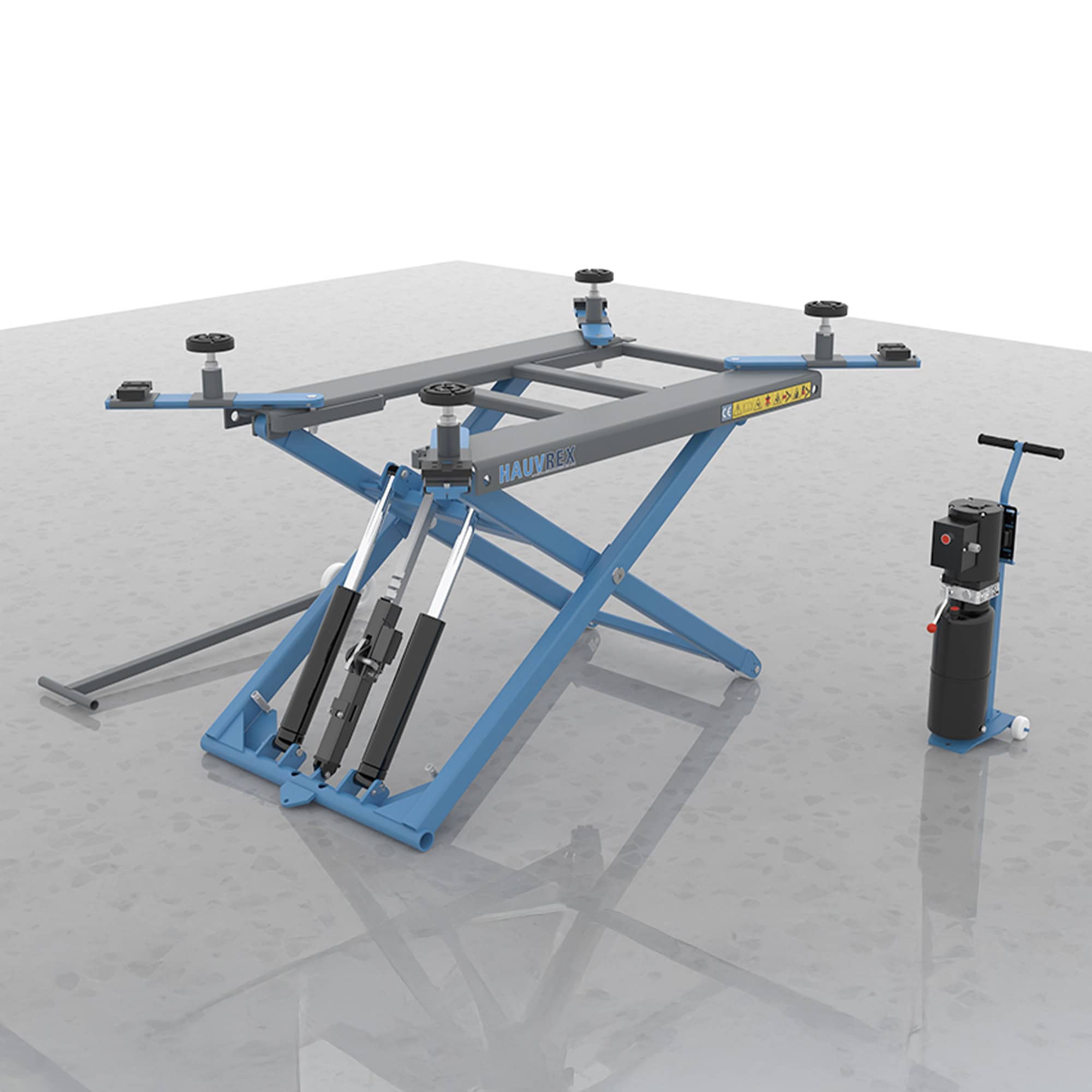 Hauvrex siirrettävä saksinostin erillisellä ohjausyksiköllä ajoneuvojen huolto-, korjaus-, rengas-, peltityö- sekä pesu- ja kiillotustöihin.
