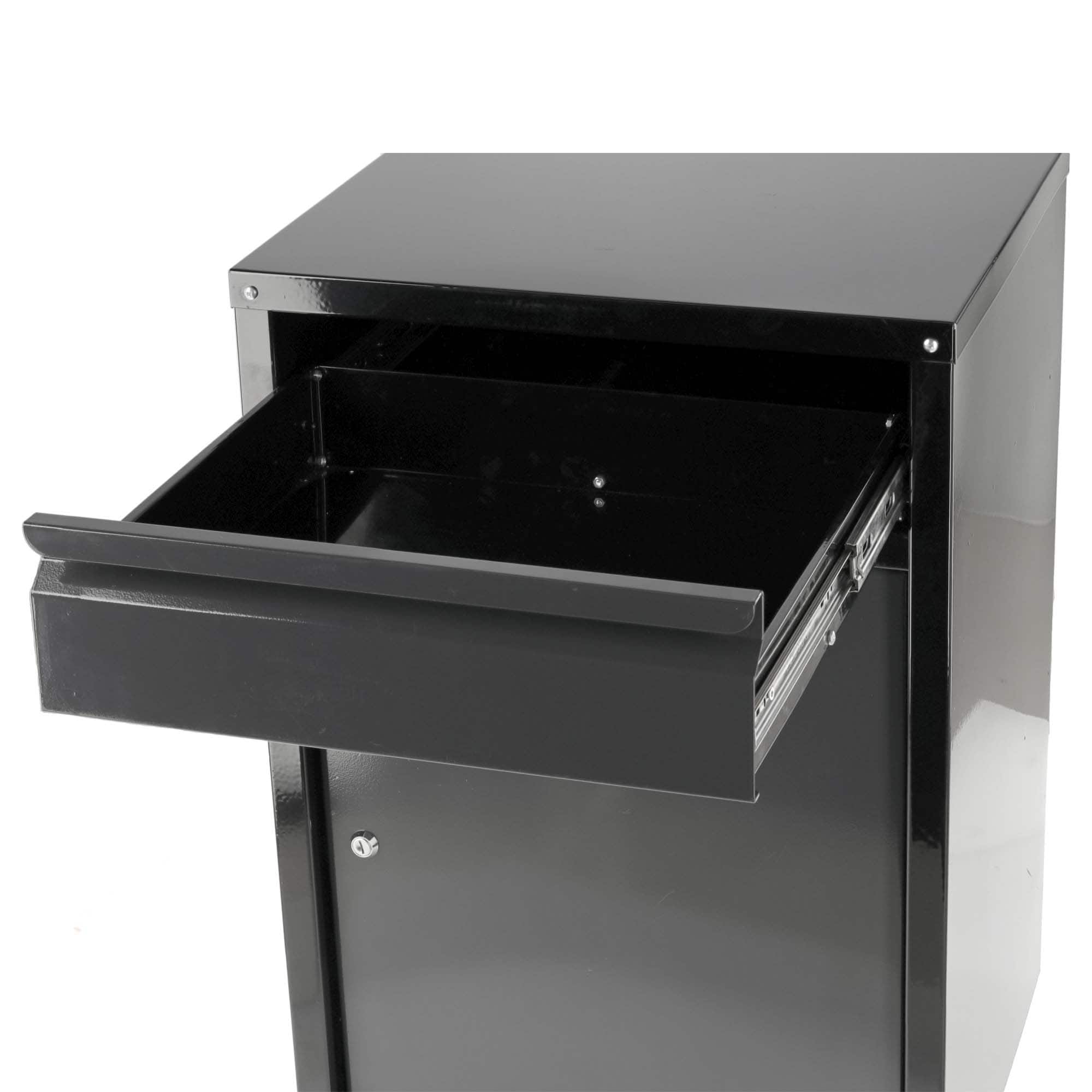 Työkalukaappi auttaa pitämään autotallin, työpajan tai huoltotilan siistinä ja järjestyksessä. Pulverimaalatusta teräslevystä valmistettu kaappi antaa kätevän säilytyspaikan työkaluille ja tarvikkeille. Tyylikäs musta viimeistely sopii monenlaisiin työtiloihin.