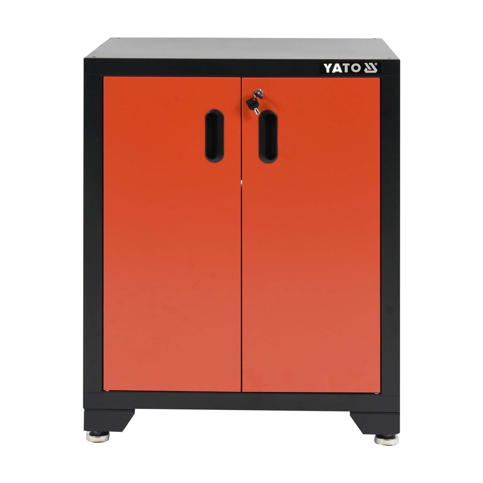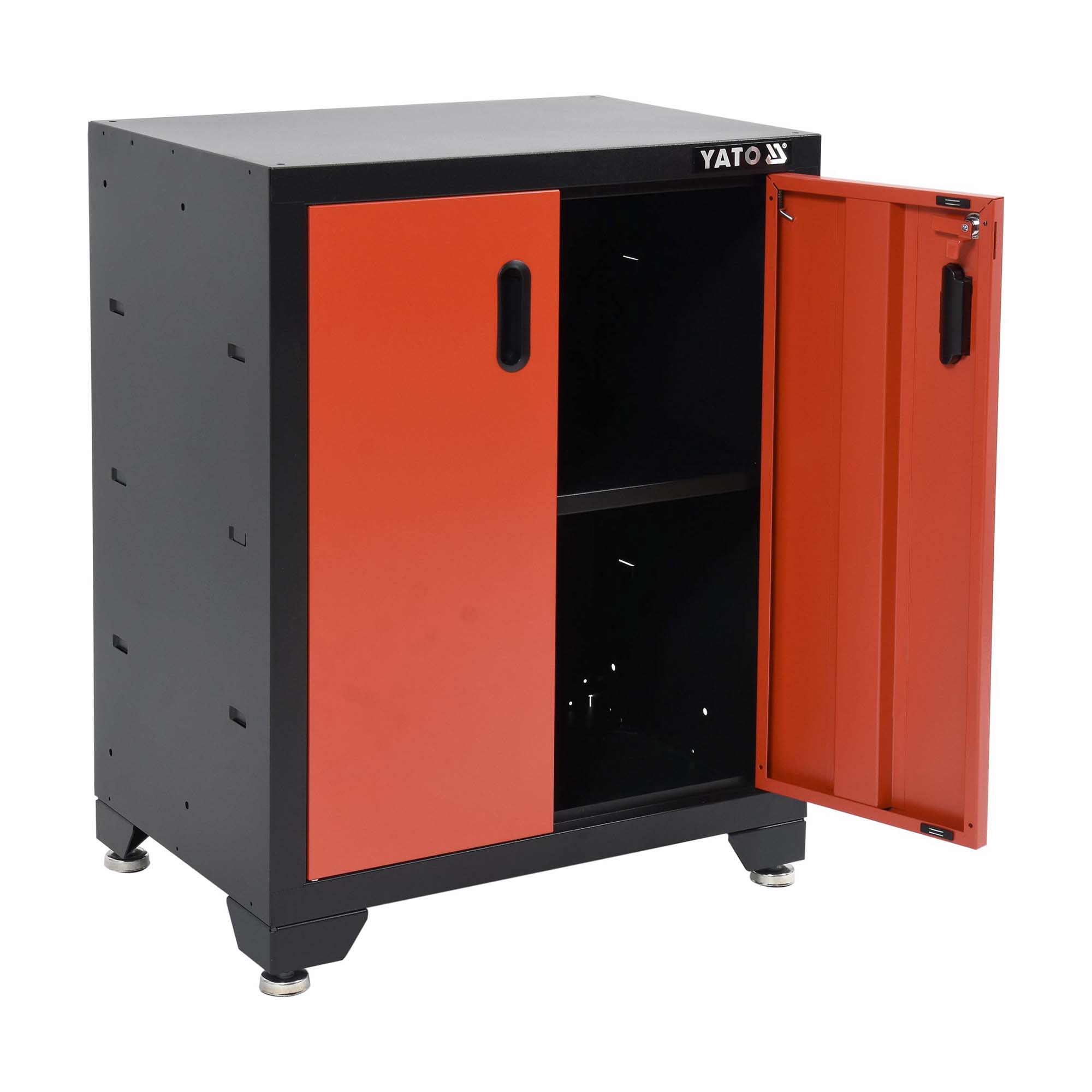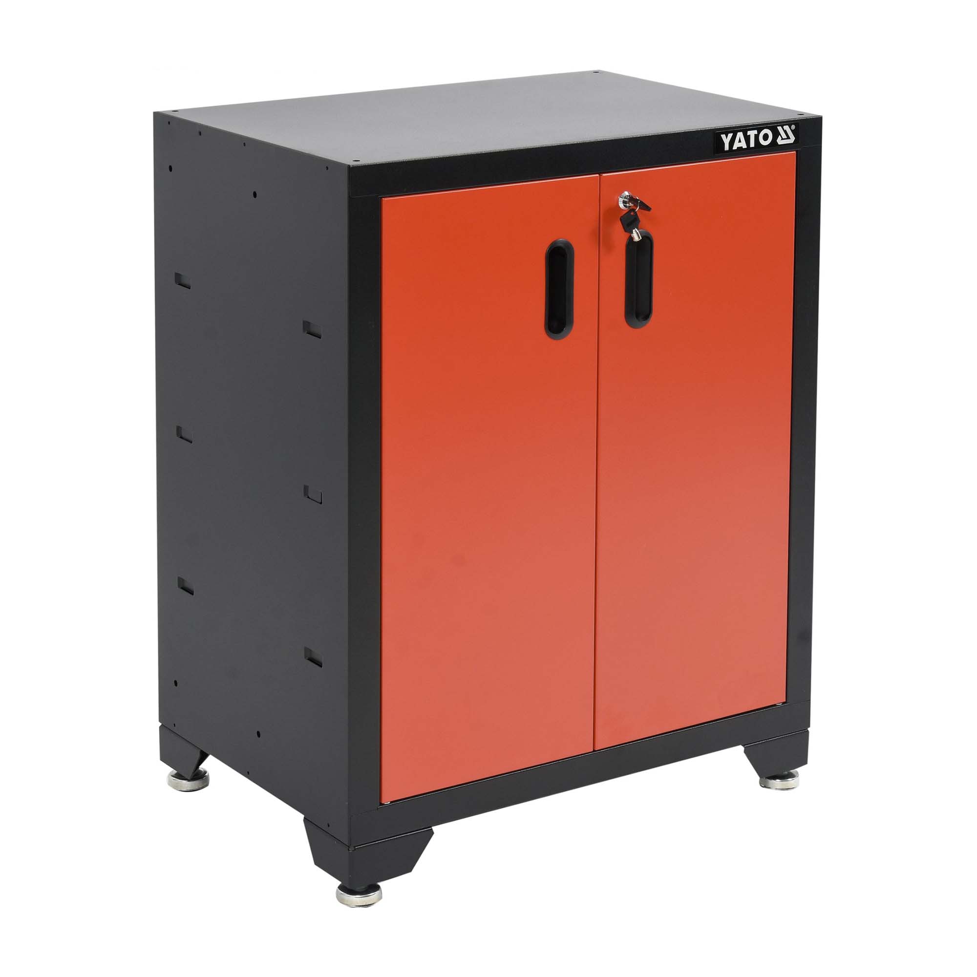 Kaapissa on kaksi lukittavaa ovea ja mukana toimitetaan kaksi avainta. Sisällä kaapissa on hylly, joka auttaa pitämään työkalut siistissä järjestyksessä. Säädettävät jalat mahdollistavat kaapin asennuksen myös epätasaisille pinnoille.