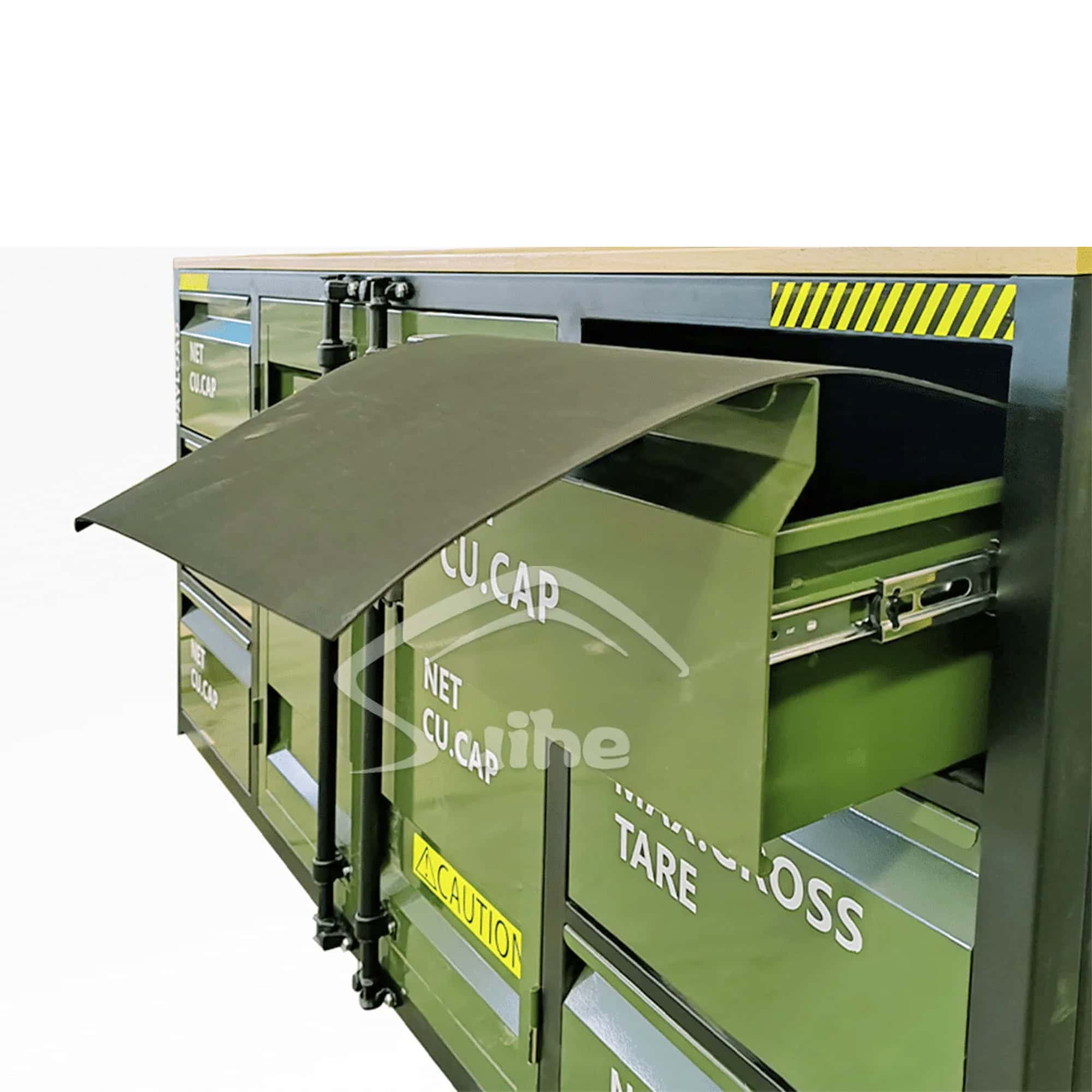 Monikäyttöinen teräskaappi autotalliin, työpajaan ja varastoon. Liukuestematot ja pehmeästi kulkevat kiskot helpottavat laatikoiden käyttöä. Siirtokahvat molemmissa päissä. Lukitus keskitetysti yhdellä avaimella. Rakenne Q235-terästä, jauhemaalattu pinta.