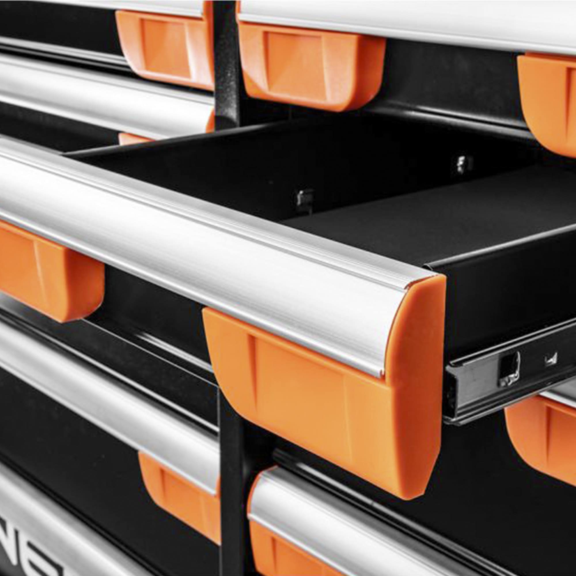 Kaappi on varustettu keskuslukituksella (mukana 2 avainta), kulmasuojilla ja sivukahvalla. Vetolaatikot ovat yhteensopivia esimerkiksi NEO-työkalusisusteiden kanssa, mikä tekee siitä erinomaisen osan ammattimaista työpistekokonaisuutta.