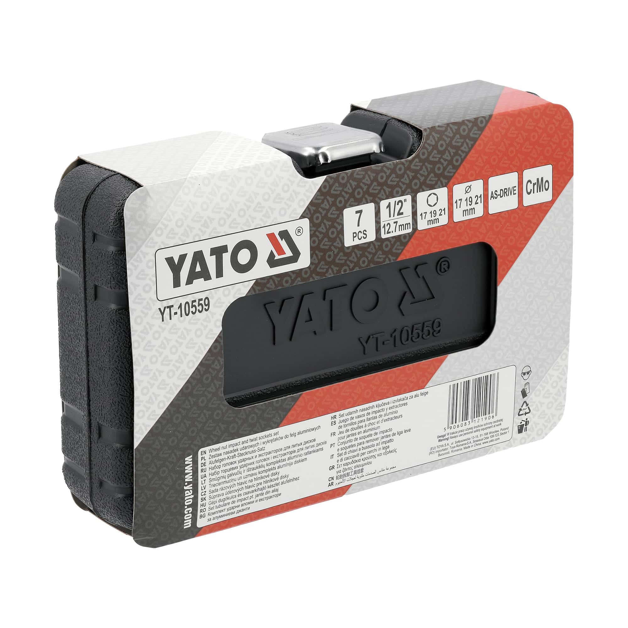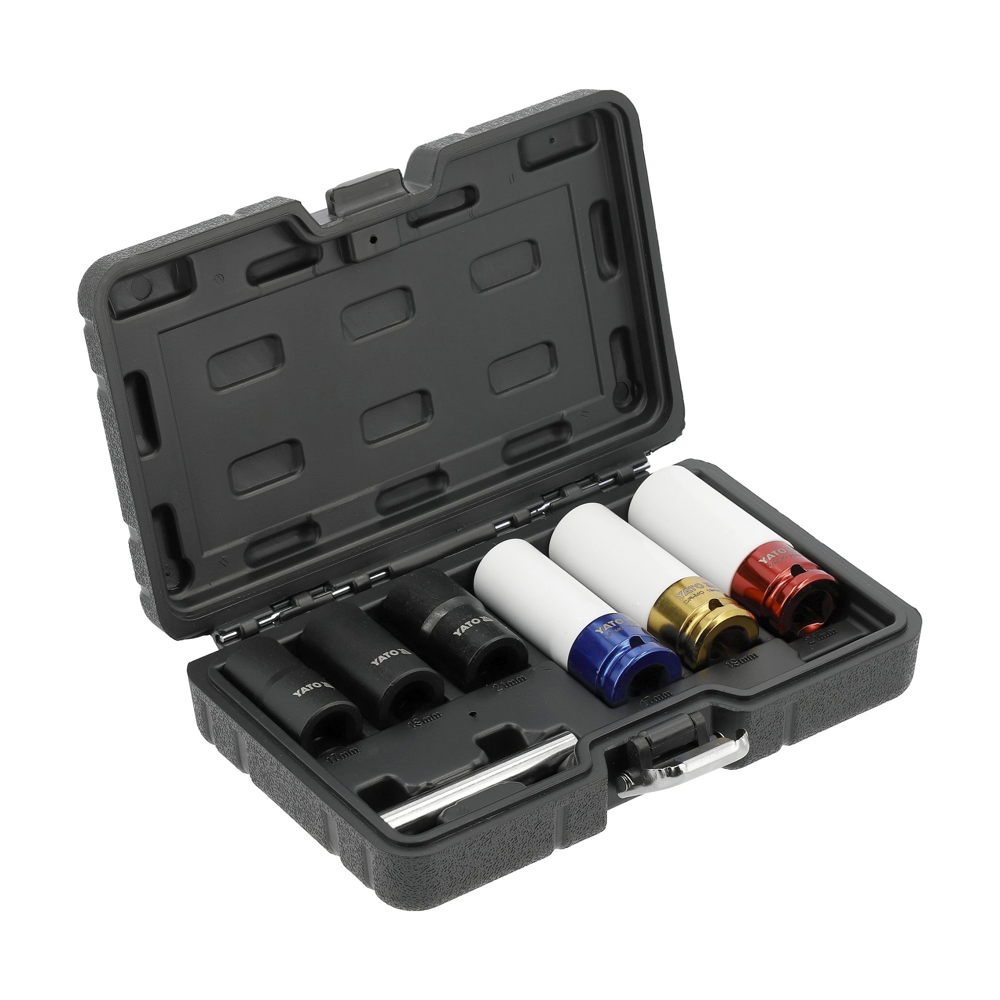 7-osainen Yato 1/2” vannehylsysarja avaa ja kiristää alumiinivanteiden mutterit sekä irrottaa jumiutuneet pultit tehokkaasti kestävien CrMo-hylsyjen ja As-Drive-rakenteen avulla.