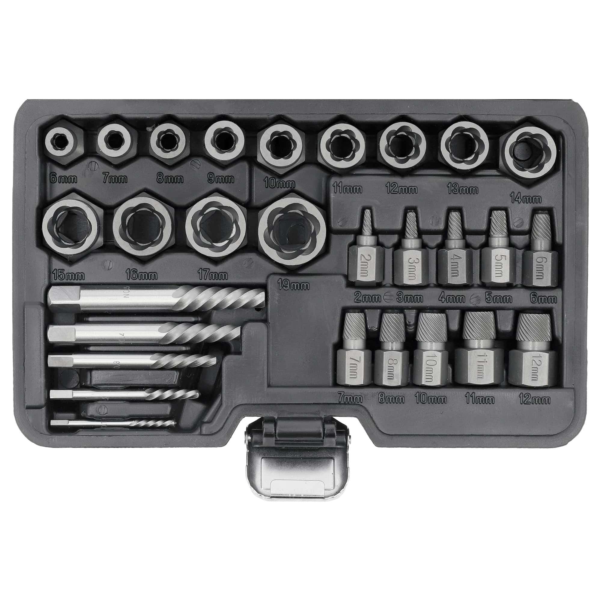 Vastakierretyökalusarja vaurioituneiden, jumittuneiden tai katkenneiden ruuvien, tappien ja muttereiden irroitukseen. Sarjan laaja kokovalikoima mahdollistaa sekä teräs- että alumiiniosien käsittelyn, vaikka ruuvinkannat olisivat vaurioituneet, kannat kuluneet tai kierteet jumittuneet.