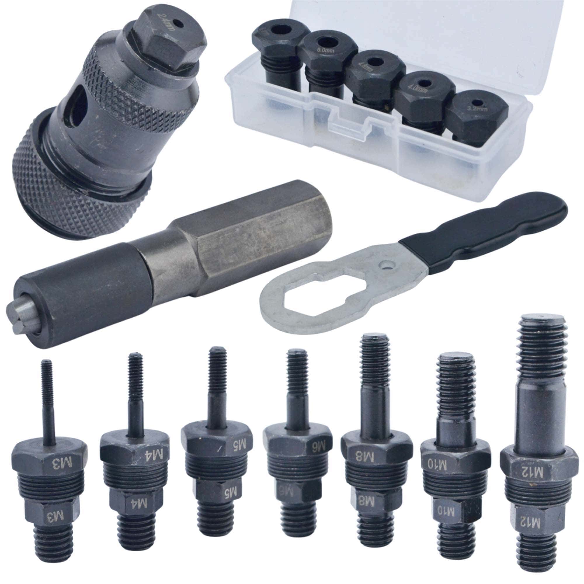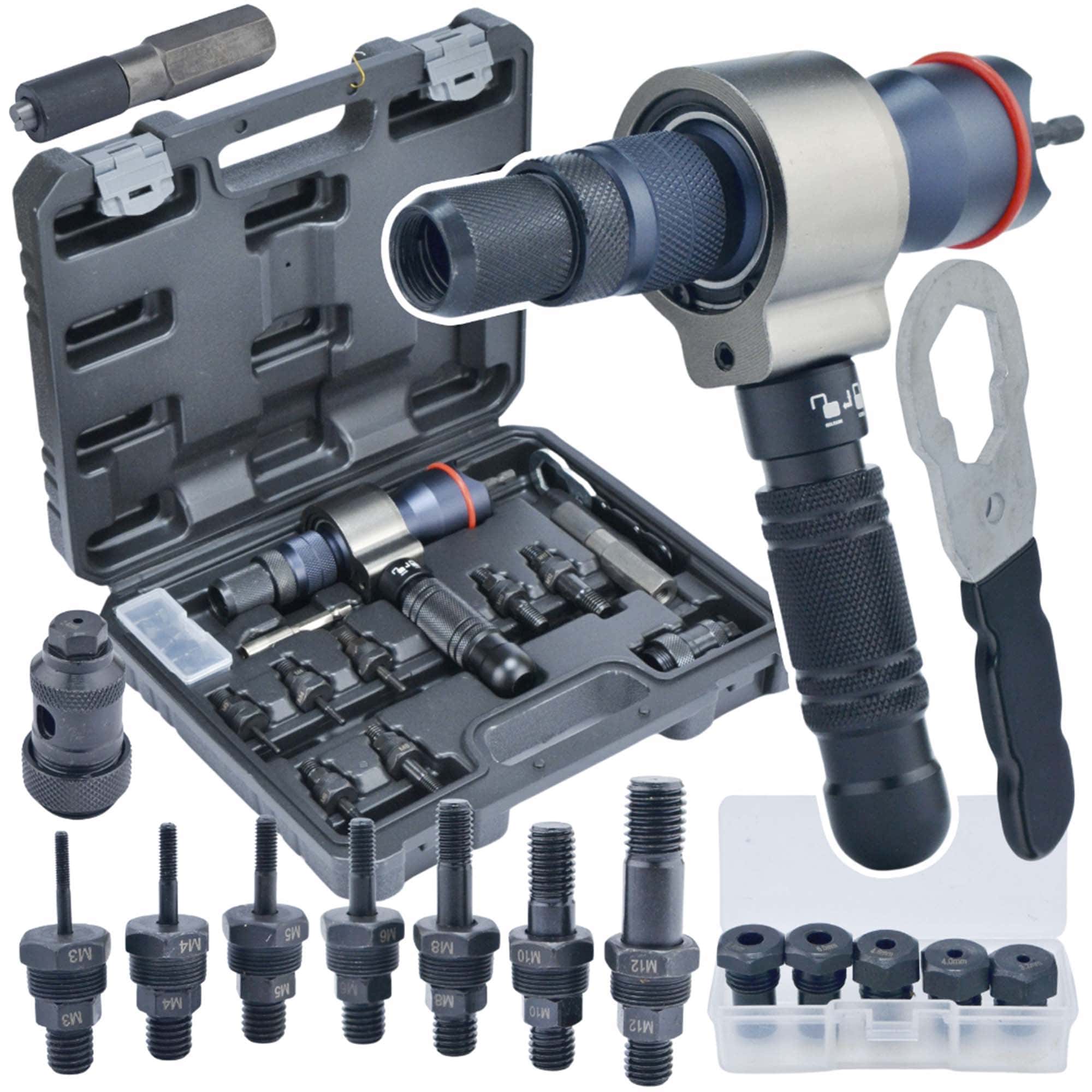 Laite tukee laajaa valikoimaa kokoja: niittimutterit M3–M12 sekä vetoniitit 2,4–6,4 mm. Vetoniitti-istukka toimii useiden eri materiaalien kanssa, kuten alumiini, kupari, teräs ja ruostumaton teräs. Toimitukseen sisältyy tukeva muovinen kuljetussalkku.