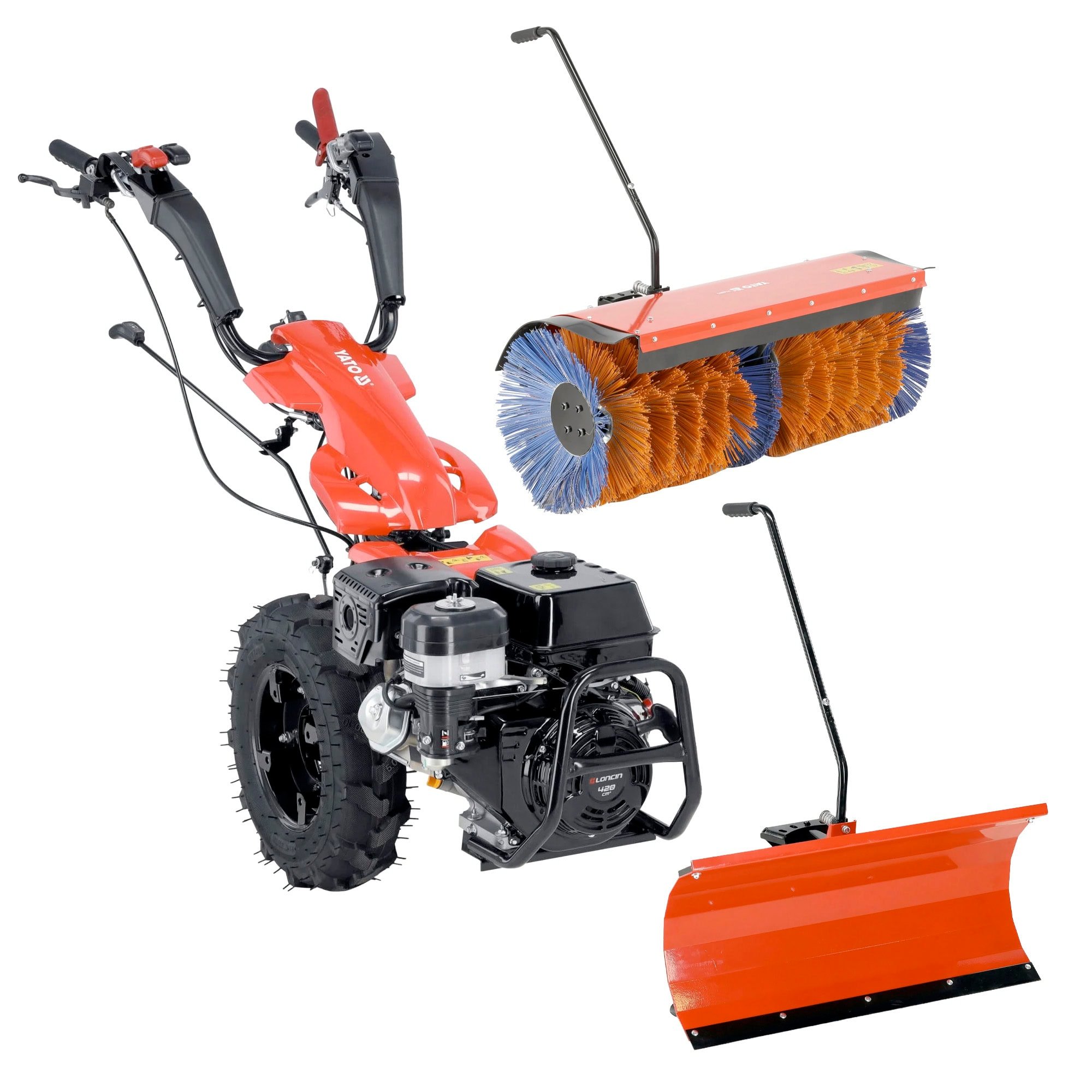 Tuotepaketti sisältää Yato yksiakselisen traktorin / kävelytraktorin (420 cm³) sekä 1000 mm harjakoneen ja 1000 mm lumilevyn, jotka mahdollistavat tehokkaan työskentelyn ympäri vuoden. Tehokkaalla LONCIN-bensiinimoottorilla varustettu traktori soveltuu monipuolisesti maatalous-, piha- ja viherrakennustöihin sekä pihojen puhdistukseen ja lumen poistoon.